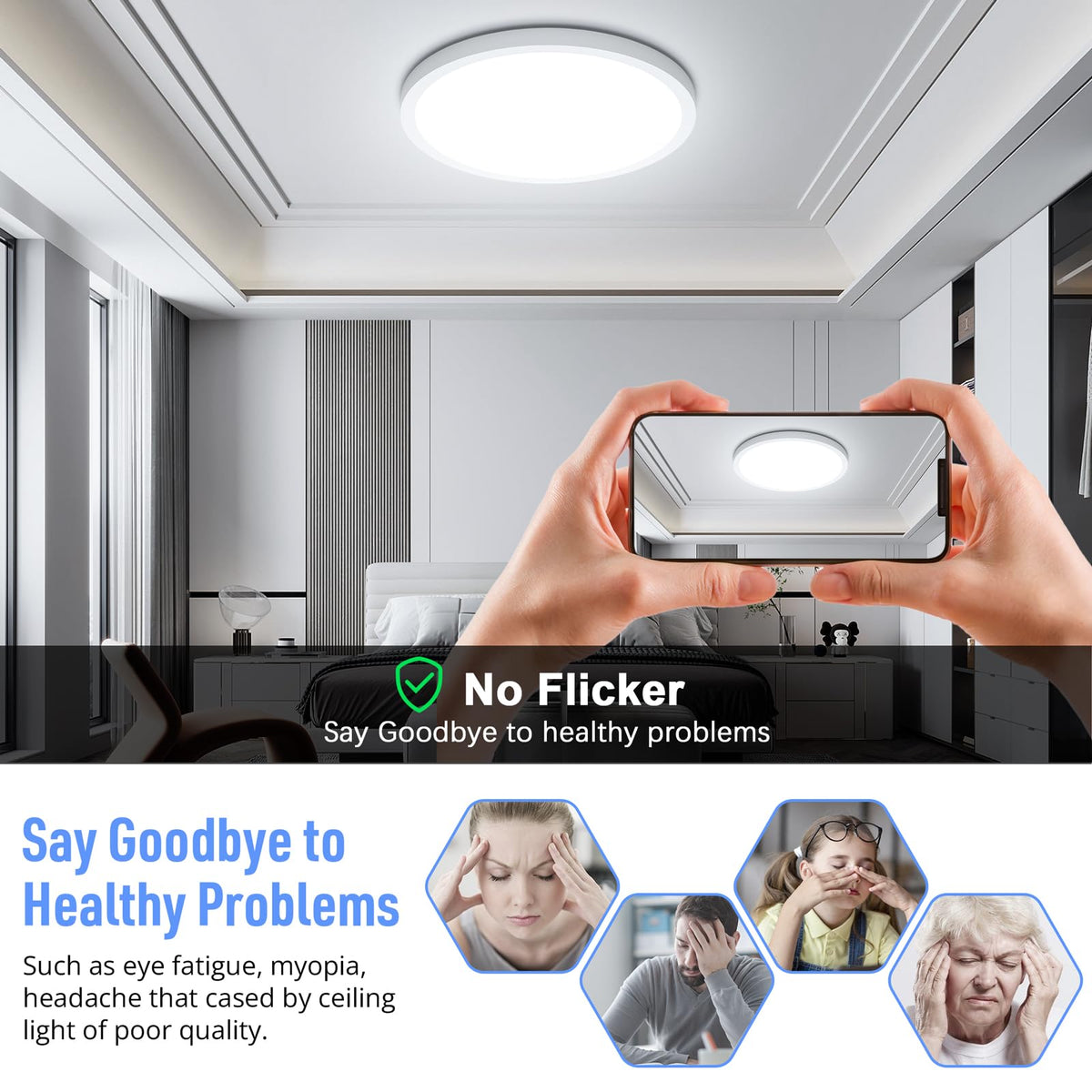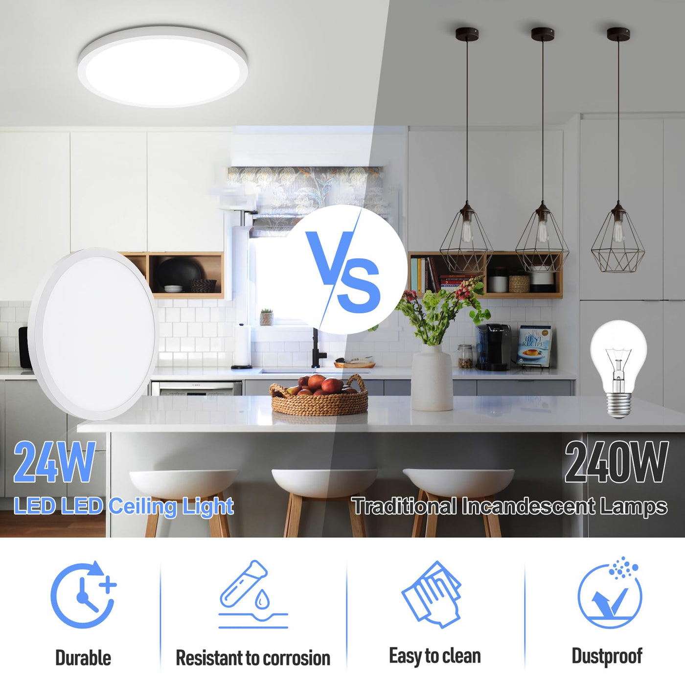 Introductions: Specifications: Dimmable: No Diameters: 12 Inch Thickness: 0.71 Inch Shape: Round Flat Light Color: 5000K Daylight White Shade Color: White Wattage: 24W Equiv. Wattage: 240W Brightness: 2400Lm(Highest Brightness) Voltage: 100-130V Wattage:24W Frequency: 60Hz Beam Angle: 120? Color Rendering Index: 85+ Lifespan: 50000 Hours+ Waterproof: Ip20 Number Of Led Bead: 126 Leds Style: Classic/Modern Power Source: Corded-Electric Installation Way: Ceiling Mount Features: Long Lifespan, High Brightness, Slim, Ultra Thin, High Cri, Energy Saving, No Flicker, Nontoxic, Not Dimmable, Stable Light, Easy To Clean, Dust Proof, Durable, Resistant To Corrosion Recommended Applications: Bathroom, Kitchen, Basement, Hotel, Powder Room, Restaurant, Bedroom, Study Room, Farmhouse, Living Room, Mudroom, Guest Room, Galley, Dining Room, Kids Room, Nursery, Utility Room, Home Office, Workshop, Shop, Office, Hallway, Entryway, Porch, Balcony, Bar, Cafe, Foyer, Mudroom, Guest Room, Galley, Attic, Basement, Garage, Staircase, Stairwell Installation Steps: 1. Unscrew The Mounting Plate From The Base Of The Ceiling Light. 2. Attach The Mounting Plate To The Junction Box Of The Ceiling By Using The Screws. 3. Connect The Wires Correctly By Using The Wire Connector. 4. Rotate The Ceiling Light To The Mounting Plate. Package Included: 6 X Led Ceiling Light Fixture 1 X Tool Kit 1 X User Manual Notice: Cut Off Power Before Installing Or Cleaning The Light. Do Not Put The Light In Overheating Working Condition Or Cast It Into The Fire. Do Not Retrofit The Product, The Bulb Does Not Be Included.