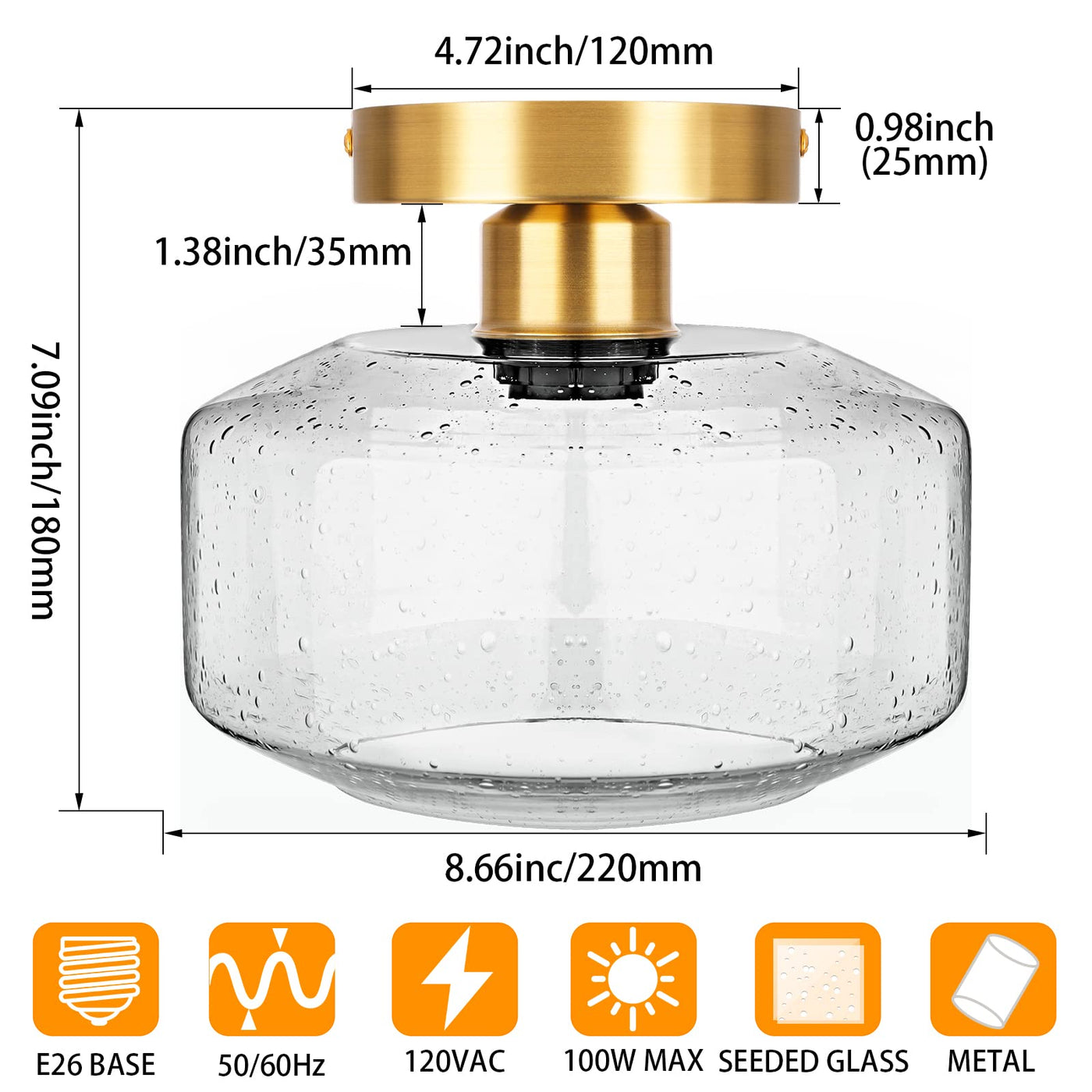 Q: What materials are used in the construction of this light fixture?A: The Semi Flush Mount Ceiling Light is crafted from high-quality brushed golden metal and seeded glass, ensuring durability and a stylish appearance that complements modern and vintage decor alike.