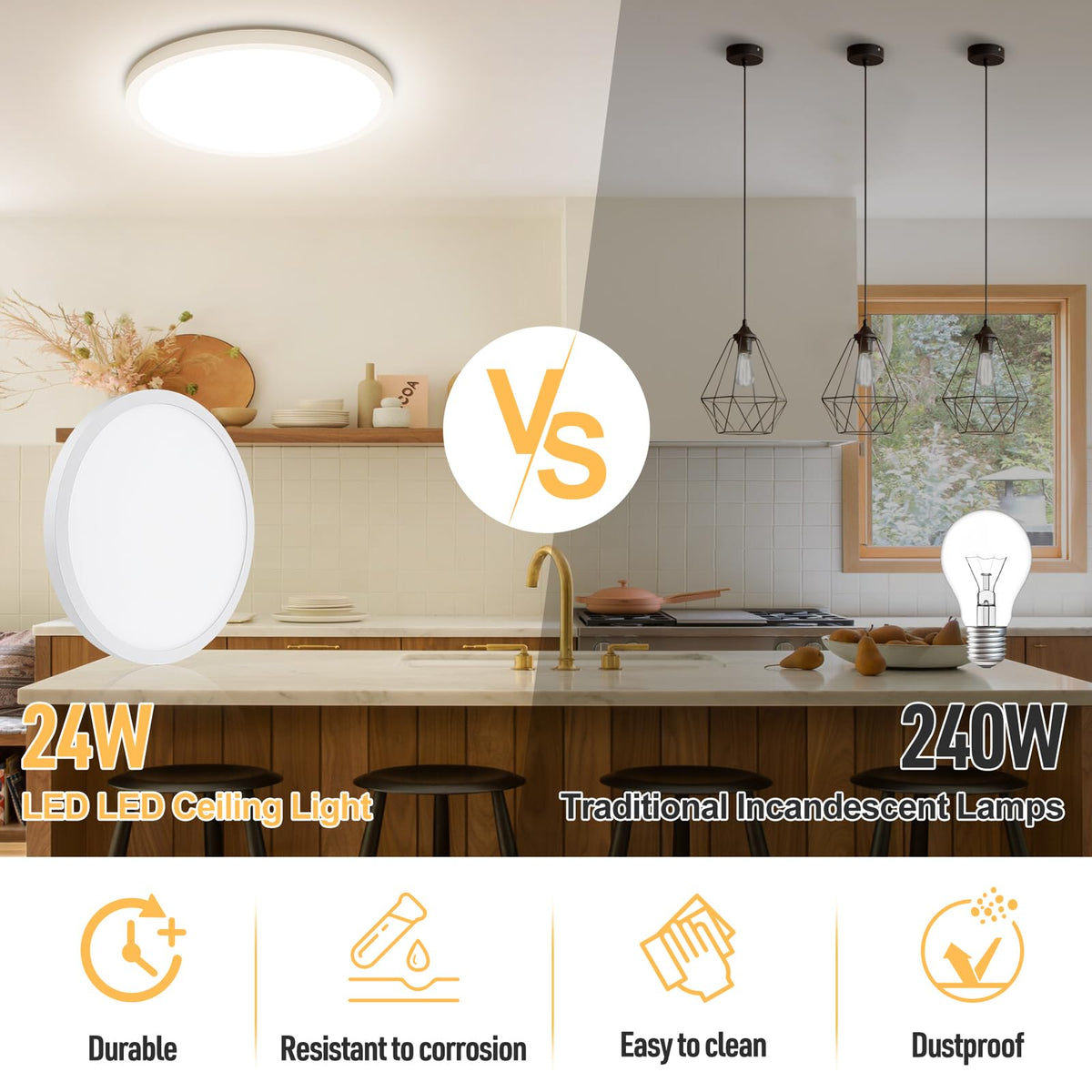Q: How energy efficient is the SunRider LED Flush Mount Ceiling Light?A: This ceiling light fixture uses only 24 watts of energy while providing 2400 lumens of brightness, which is equivalent to a 240W incandescent bulb, offering up to 90% energy savings.