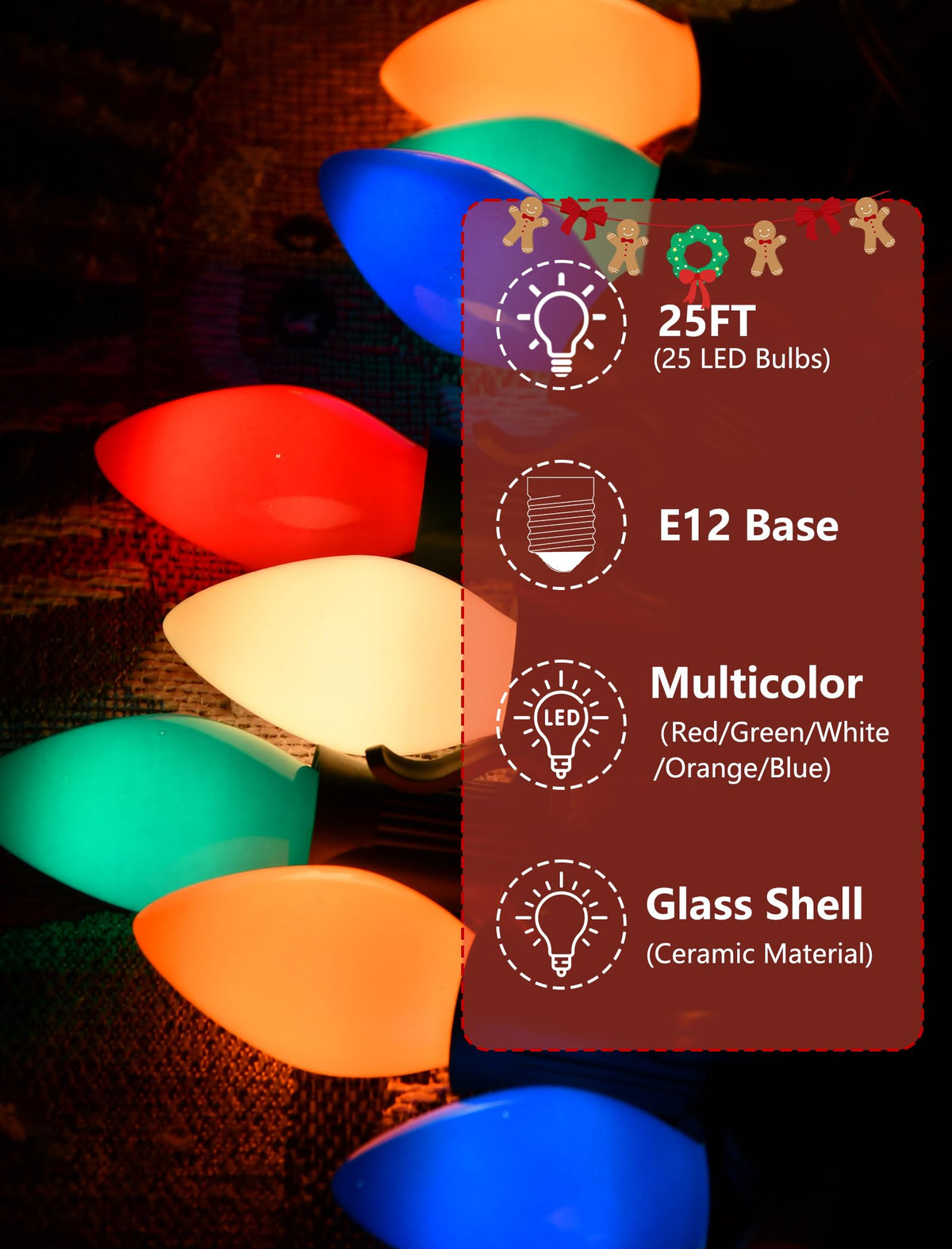 SUNSGNE C7 LED Christmas Lights, 25FT Multicolor Outdoor String Lights, Ceramic Glass Bulbs, Green Wire