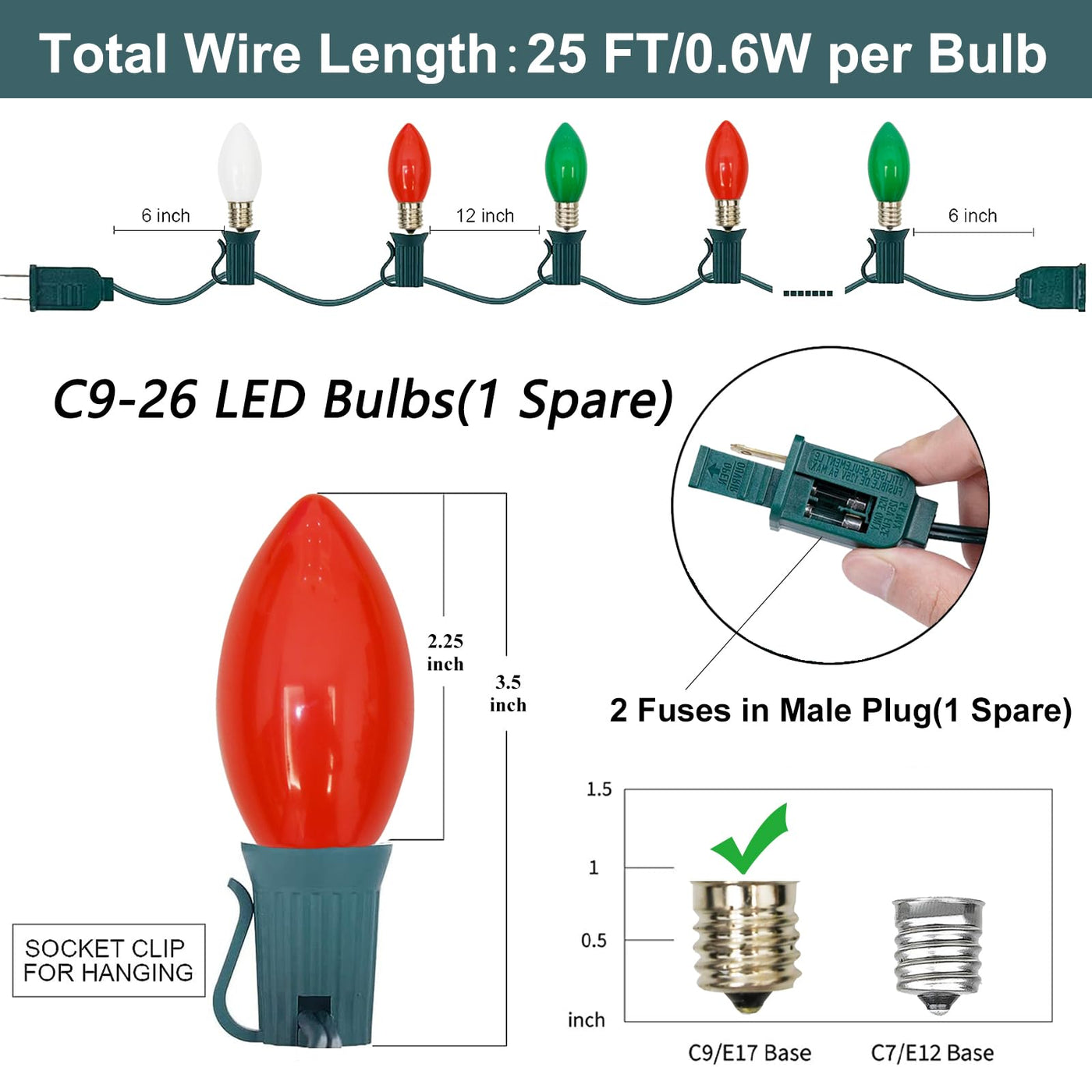 There Are 25 Bulbs And 25 Sockets Per String Lights And 1 Extra Bulb For Replacement. C9 Is The Type Of Bulb, And E17 Is The Type Of Socket. C9 Light String, Ul Listed String Lights For Outdoor, Indoor, Halloween, Christmas, Garden, Camper, Wedding, Party, Market, Porch, Gazebos, Patio, Pergolas, Decks, City Rooftops, Bistro, Backyard Holiday Decor. Note : The Distance Between Two Bulbs Is 12 Inches. Specifications Bulb Information: Source Type: Led Bulb Shape: C9 Bulb Quantity: 26 Bulbs(1 Spare) Bulb Height: 2.86 Inch Bulb Life Span: 20,000 Hours Bulb Color: Red White Green Color Temperature: 2700K Dimmable: Yes(Dimmer Not Included) Material Of Bulb Housing: Plastic Bulb Type: C9/E17 Base, 0.6 Watt Wire Information : Plug Type: 2-Prong Plug Input Voltage : Ac 120V Wire Gauge: 20Awg Xtw Wire Color: Green Socket Type: C9/E17 Socket Base Total Length: 25 Feet Bulb Spacing: 12 Inch Plug To First Bulb: 6 Inch Last Bulb To End Plug: 6 Inch Extendable: Connect Up To 28 Strands / 432 Watts Together Maximum Package Includes 1 X 25 Feet Outdoor String Lights 1 X 26 0.6W Red White Green Light Bulbs(1 Spare) 1 X Spare Fuse (Already Installed In Fuse) 1 X Instruction Manual Cautions : 1. Please Turn Off The Power Before Installation. 2. Don'T Touch The Bulb When It'S Working Or Hot. 3. Please Make Sure That The E17 Base Type Of The Bulb Match Your Lamp Before Placing An Order.