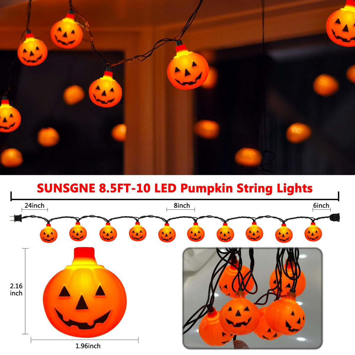 Q: What is the length of the SUNSGNE Halloween Pumpkin String Lights?A: The SUNSGNE Halloween Pumpkin String Lights measures 8.5 feet in total length, featuring 10 LED pumpkin lights spaced 8 inches apart.
