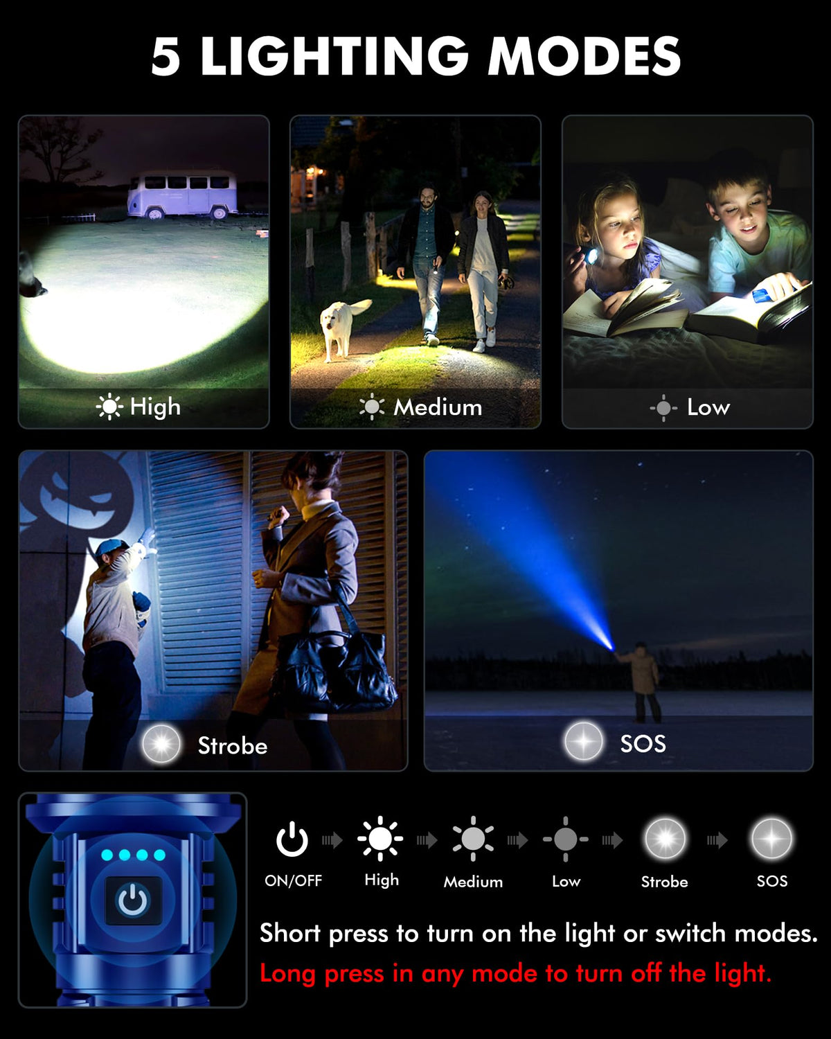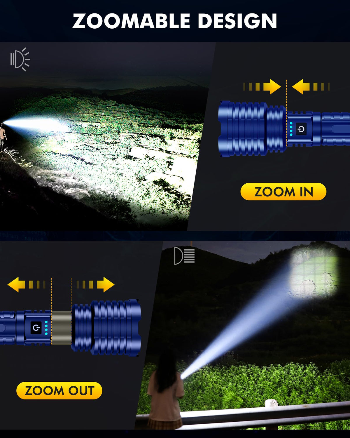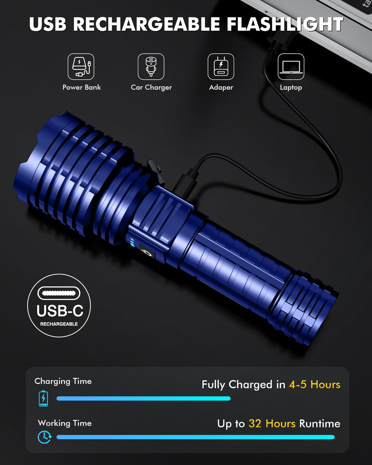 'Are You Still Afraid Of The Darkness? Are You Looking For A Powerful Light? The Baibian Super Bright Rechargeable Flashlight Will Help You. It Is Made Of Full Aircraft Grade Aluminum Alloy And Is As Heavy-Duty As A Weapon. It Has A Super Brightness Of 120,000 Lumens. It'S Even Comparable To A Car Headlight. Shine The Light Across A Soccer Field Or Over A Block And Anything Very Far Away Will Be Clearly Visible. It'S Rechargeable And We Have Free Power So It'S Easy To Use. It'S Retractable And Focusable. So It Can Be Used As Both A Spotlight And A Floodlight. Whether You'Re Walking At Night Or Walking Your Dog Or Need To Work In The Dark, It'S Great For That. Product Features Product Name:Rechargeable Xhp160-A8 Led Flashlight 1800000 High Lumens Led Light Source:Xhp160-A8 Body Material:Alunmium Alloy Light Modes :5 Modes (High/Medium/Low/Strobe/Sos) Charging Mode:5V 1A Usb Charging (Cable Included) Focusing:Acrylic Lens, Zoomable Light Range:About 1200M Waterproof:Ip67, Do Not Soak In Water Application:Camping, Hiking, Dog Walking, Night Fishing, Emergency, Outdoor Contents:Xhp160-A8 Rechargeable Flashlights 1800000 High Lumens * 1, Free Power, User Manual, Hand Roop Attention Please: 1.Please Don'T Point The High Power Flashlight In Your Or Other'S Eyes Directly. 2.Direct Exposure To Led Flash Lights Can Cause Irreparable Harm To The Eye'S Retina. 3.Ip67 Waterproof Not Suitable For Water Diving. 4.Charge Fully This Rechargeable Flashlights For The First Time Use. 5.Keep Away From Flammable And Explosive Materials When Charging Our Brightest Flashlight. 6.Please Use The Powerful Handle Flashlight Once In 3 Months And Charge.''