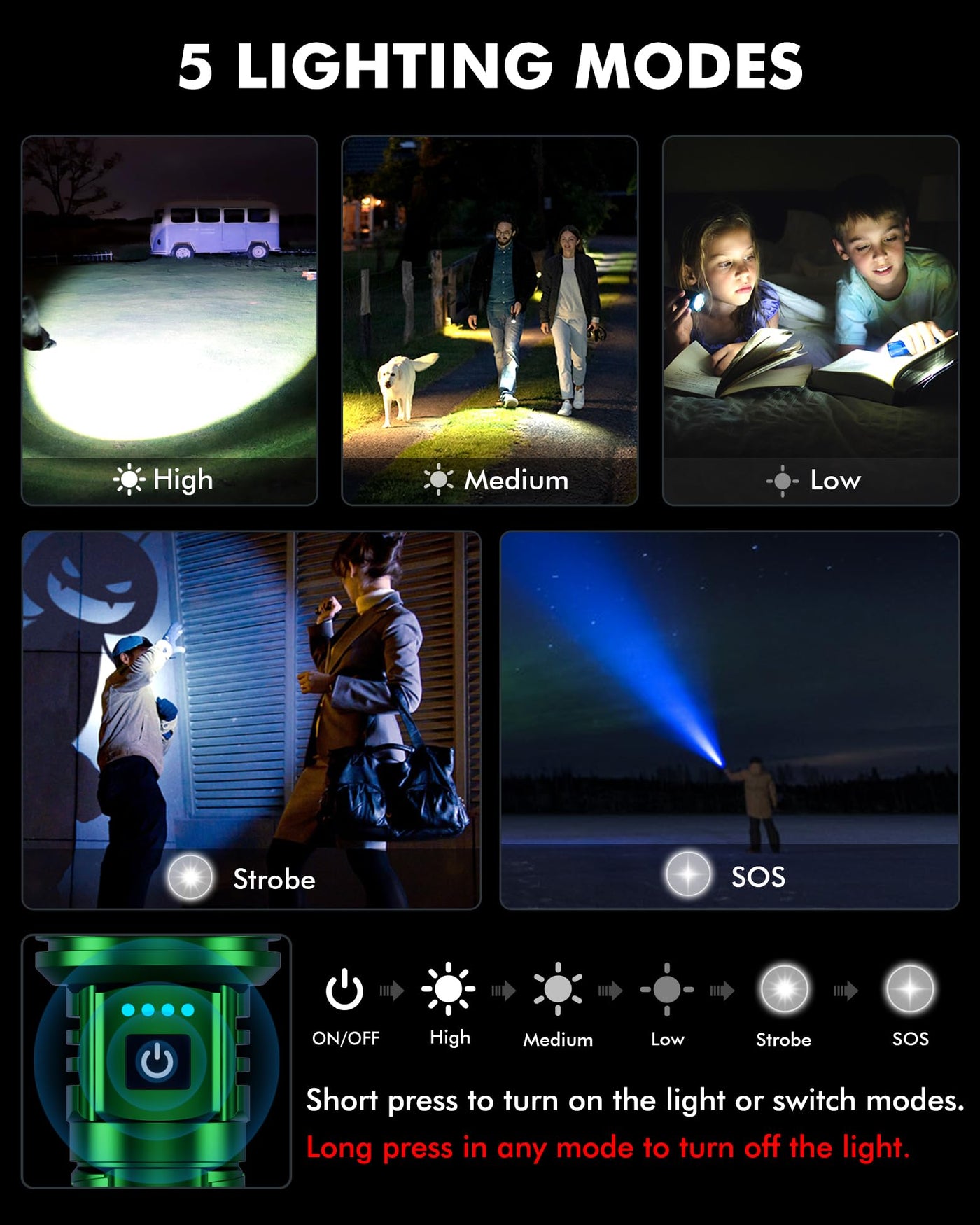 Q: What are the brightness modes available on the Super Bright Flashlight?A: The Super Bright Flashlight features three brightness modes: high, medium, and low. Additionally, it has two emergency function modes: fast flash and slow flash, making it versatile for various situations.