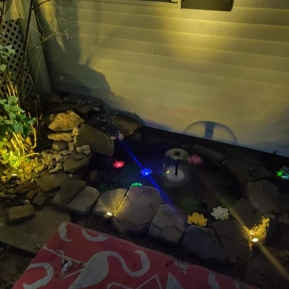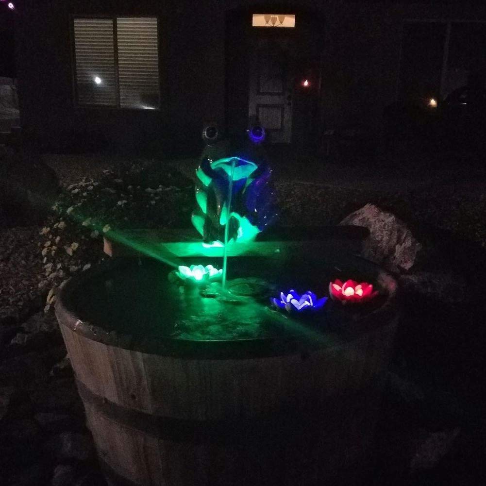 Great product lights up beautifully and looks real in the daylight. Material is good quality, lights are bright, and they stay afloat really well! Functional and aesthetically pleasing! These lily pads look great in your pond & help to keep some other floating d cor in place. Need to be charged for at least one day during daylight and will come on automatically at night and the process of charging during the day/ lighting at nights will continue automatically for the rest of its natural life. Will only light up when the place is dark. There are three flowers attached to one lily pad. Three different flowers, with red, blue and green lights at night which are quite bright. The lily flower pads are 4.5 '' in diameter and the large center lily pad is 7 '' in diameter.