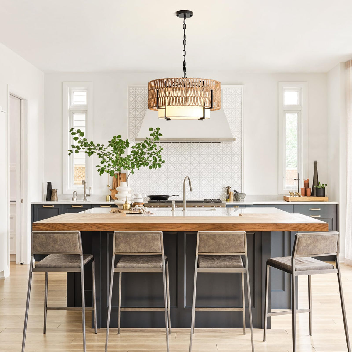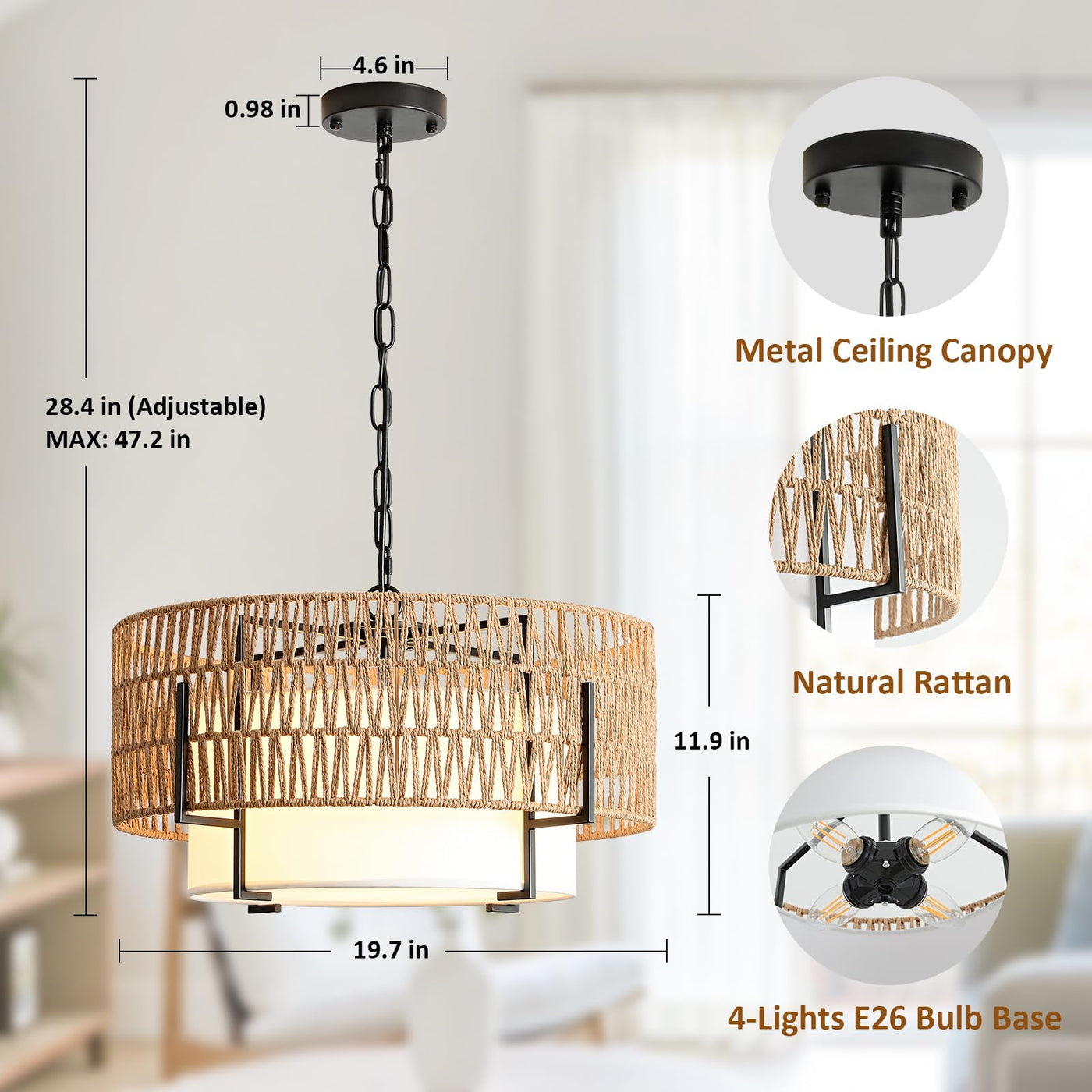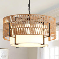 Supmaka 4-Light Rattan Chandelier, 19.7'' Boho Pendant Light With Fabric Shade, Farmhouse Rattan Hanging Ceiling Light Fixture F