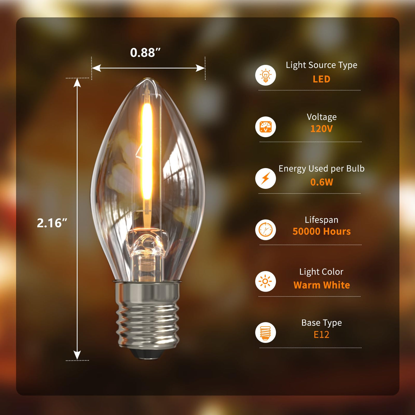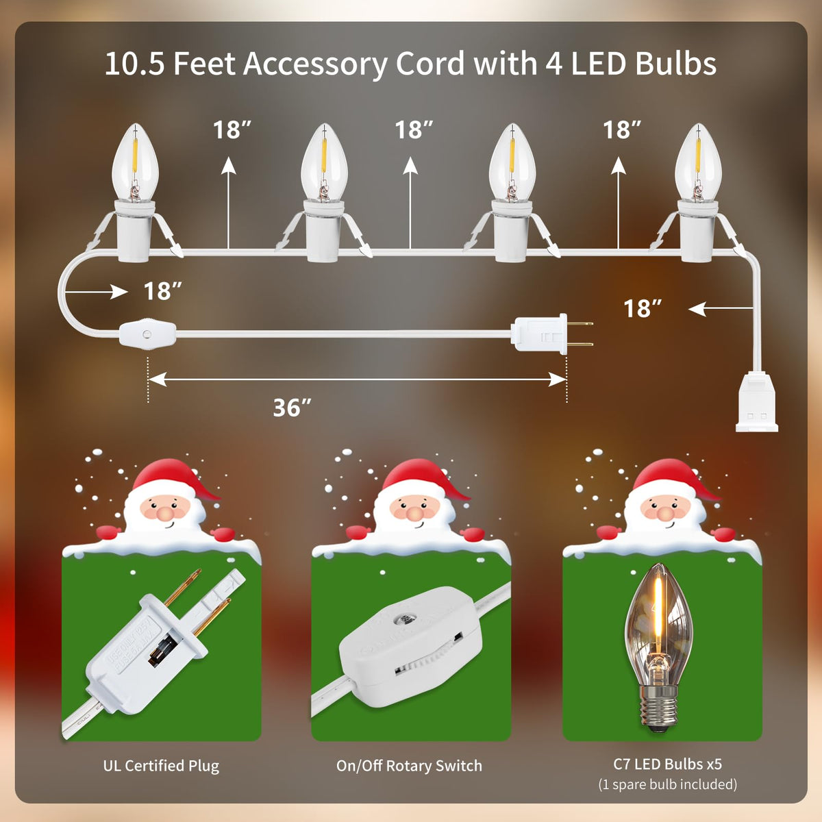 These C7 LED Christmas house light for miniature village are especially suitable for Christmas decorations, such as decorating windows, pumpkins, Christmas village houses and Christmas trees, making parties more lovely and charming. Used for nightlights, salt lamp, christmas string light, chandeliers, festival decorative, signs, exit signs, refrigerators, other E12 base bulb replacement. Tips: Please confirm the diameter of the base hole is between 0.9 and 2.2 before choosing this village light cord. Fits for most Christmas Village Lights, blow mold light kit; 360rotary switch is convenient to turn ON/OFF; 10.5 ft long cord with multi bulbs helps saving space; 2700K soft glow adds a warm touch to holiday decorations Input Voltage: 120Vac/60Hz; Bulb Space: 18'' Plug Fuse: 125V, 5A; Cord Type: SPT-1 20AWG; Fits for Christmas Village Houses, Blow Mold, Santa and Snowman, Pumpkin Lamp, Halloween Decoration, Salt Lamp, Ceramic Tree etc.