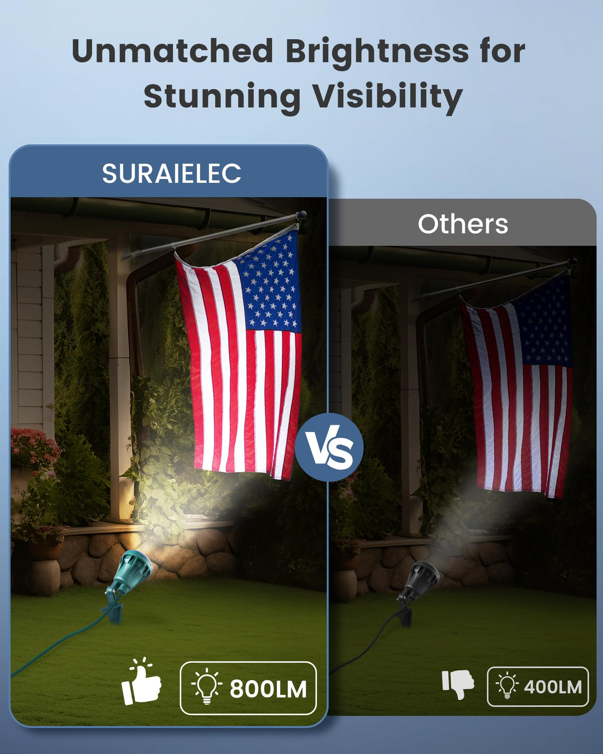 Q: Are the SURAIELEC Outdoor Spot Lights energy-efficient?A: Yes, these spotlights are energy-efficient, providing 800 lumens of brightness while consuming low energy. This makes them a cost-effective lighting solution for your outdoor areas.