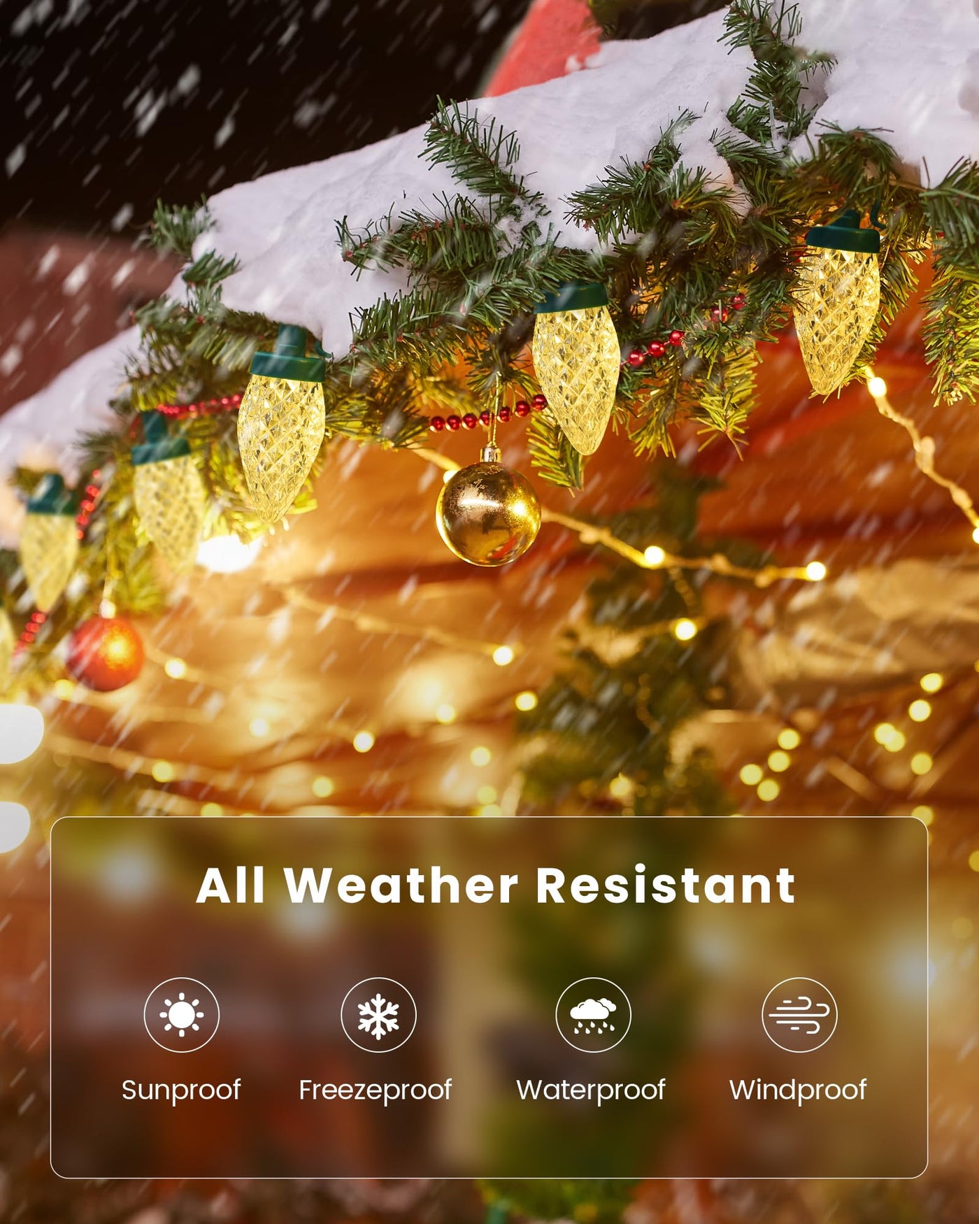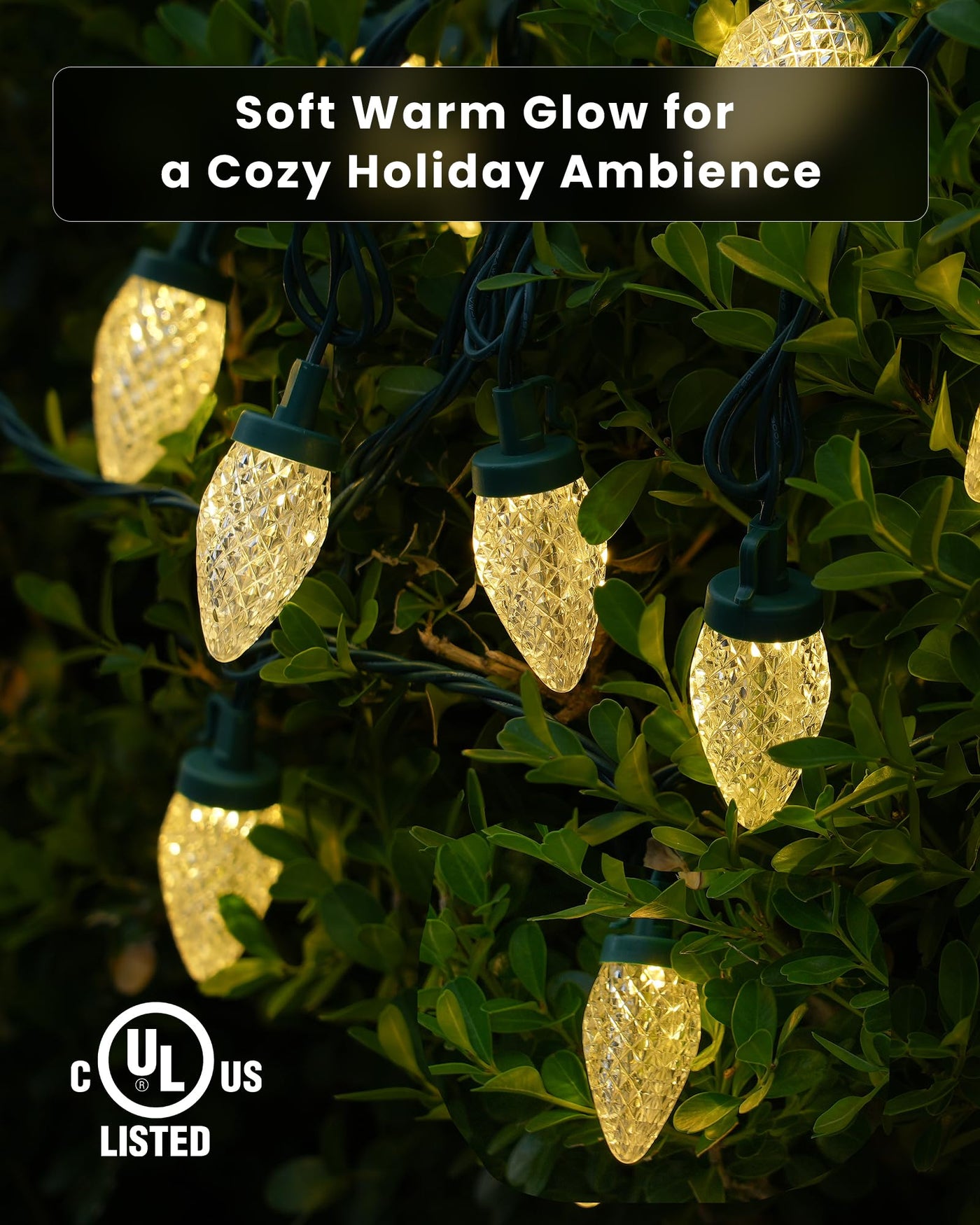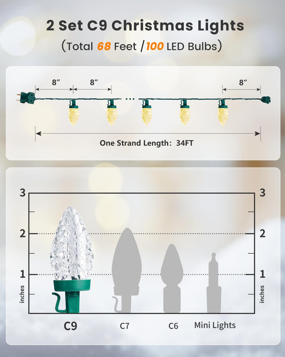 C9 Christmas Lights Outdoor - Illuminate Your Holiday Season Transform your outdoor spaces into a winter wonderland with our C9 Christmas Lights Outdoor. This product includes two sets, each featuring a generous 34 feet of sparkling illumination, adorned with 50 warm white LED bulbs that are strategically spaced 8 inches apart for a truly enchanting display. The soft, elegant glow of these lights will effortlessly outshine traditional incandescent strings, creating a warm and inviting atmosphere for your Christmas tree, yard, patio, or any festive gathering. End-to-End Connectivity: Designed for ultimate convenience, our lights feature easy plug-and-play functionality, allowing you to connect up to 72 strands end-to-end or pair them with other lighting options for a magnificent total of 216 Watts. Customize your festive d cor to achieve the perfect length and coverage for your home. Ample Length & Thoughtful Design: With a total lighted length of 34 feet and 8-inch spacing between bulbs, our lights offer the flexibility to wrap around trees, decorate eaves, or line walkways. The sturdy green three-corded wires are tangle-free and blend seamlessly with your outdoor greenery, ensuring your d cor is both elegant and practical. Durability & Safety Assured: Our C9 Christmas Lights are UL Listed and waterproof, making them perfect for both indoor and outdoor use. Easily hang these warm white string lights to craft a cozy ambiance for various occasions, including parties, weddings, and festive celebrations. Specifications(Each Strand): - Bulb Quantity: 50 pcs - Bulb Length: 2.2 inches - Bulb Spacing: 8 inches - Lead Length: 8 inches - Total Length: 34 feet - Input Voltage: 120VAC 60Hz Elevate your holiday d cor with our C9 Christmas Lights Outdoor - the perfect choice for creating stunning and memorable displays throughout the season. Order now to light up your festivities!