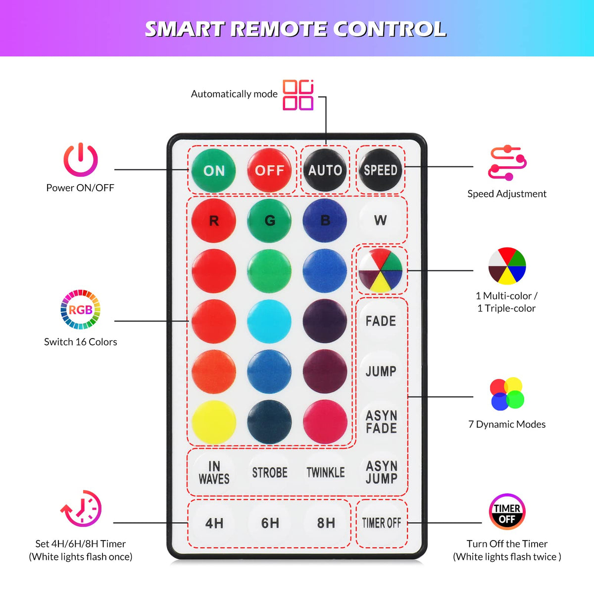 - Q: How do I control the lighting modes and colors? A: You can control the lighting modes and colors using the included remote controllers, which allow you to turn the lights on and off, change colors, select from 8 lighting modes, and set timers for 4, 6, 8, or 24 hours. The built-in controller on the string also provides similar functionalities.