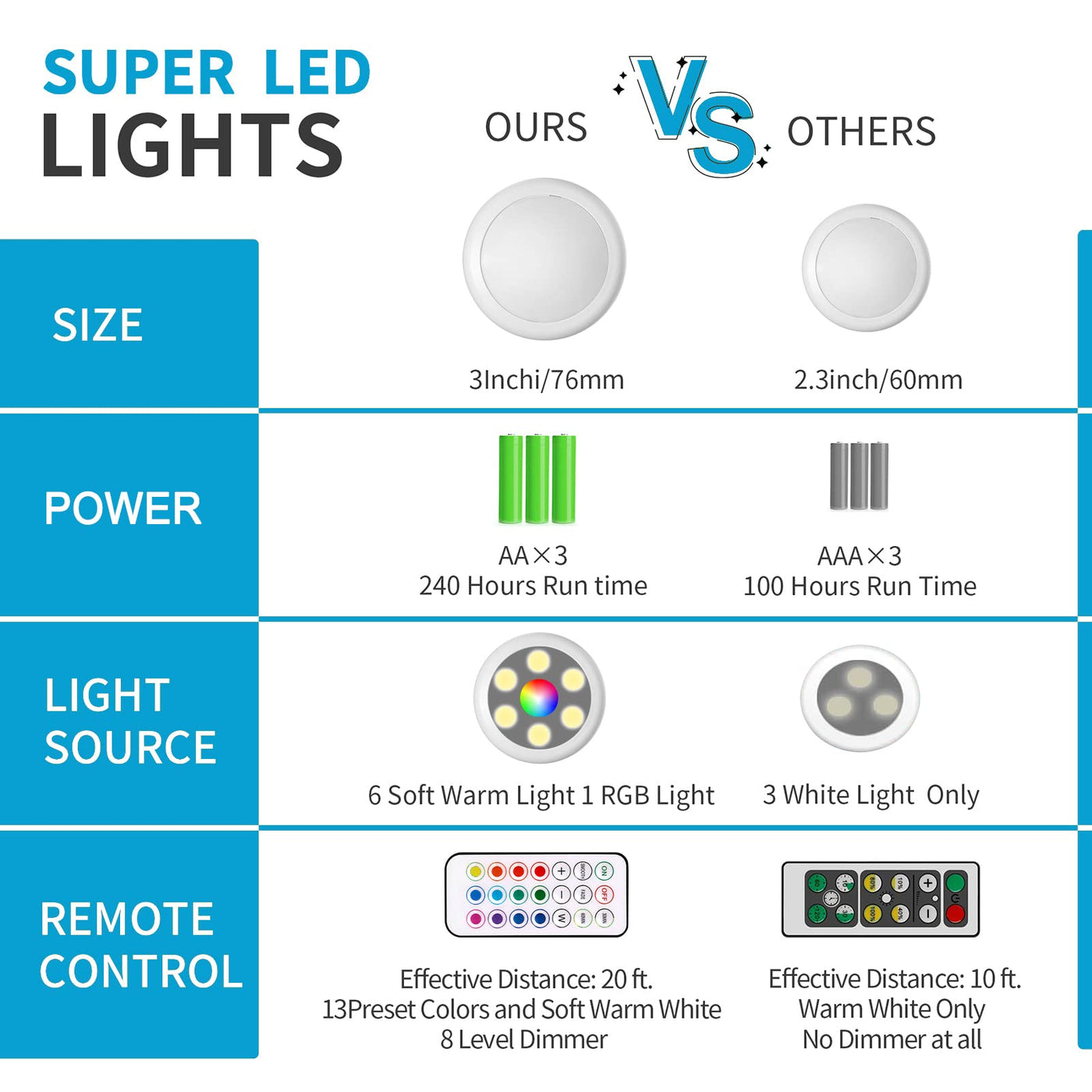 Q: What are the key features of the Swesara LED Puck Lights?A: The Swesara LED Puck Lights feature RGB color changing options with 16 hues, a dimmable function, a timing feature that allows for automatic shut-off after 30 or 60 minutes, and remote control operation for convenience. They are battery-operated and designed for easy installation under cabinets, in closets, or any space needing additional lighting.