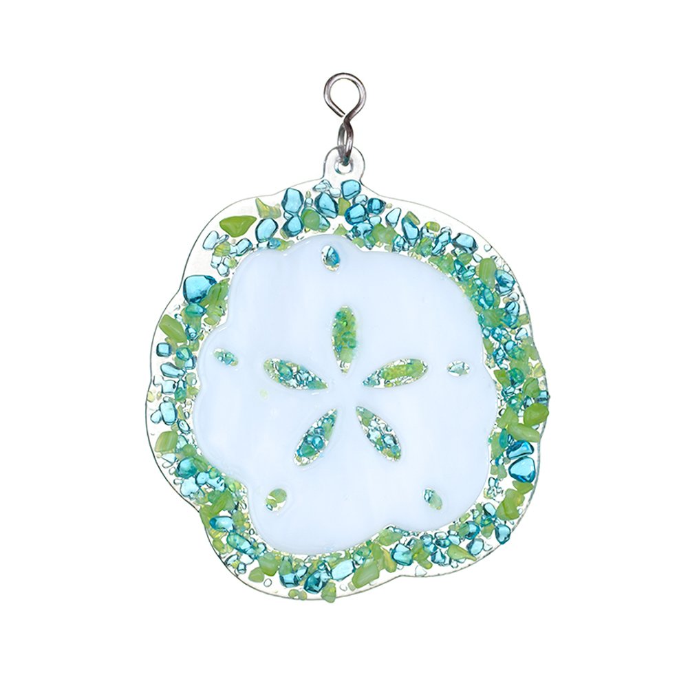 This Coastal Sand Dollar design hangs beautifully on our patented rotating nightlight plug, lighting up any room of your house. Perfect for any beach decor room! *Patented Plug is Sold separately from all stained glass covers* With over 250 designs, you can swap another in when your style changes. Switch your style, not your plug. This is a fused stained glass cover - made with clear background glass. Shown on our handmade table lamps for photo purposes only and not included with glass cover.