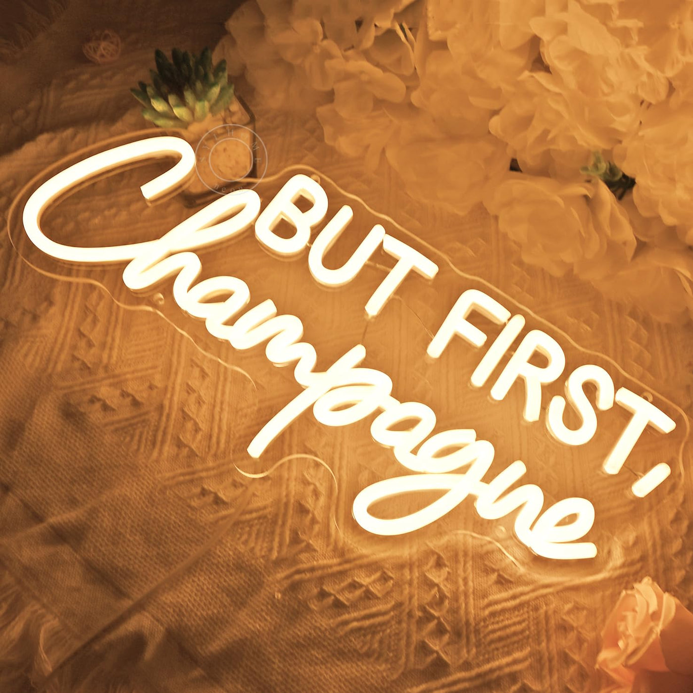 LED neon light signs But First Champagne decoration for kids’ Room bedroom living room game room window wall sign hanging wedding party birthday Children's Day Valentine’s Day proposal Christamas NOTE: Does NOT include a power adapter. Turning on the neon sign to have fun and be relaxed. Decorate your home with the light and surprise your loved one or family. Color your wedding ceremony, performance, celebrations, bachelorette party, birthday, proposal, Valentine’s Day or any parties. The neon sign is also a great gift for girls and boys on Children's Day, Christmas or other festavils. You will feel happy and keep away from insecure when it is a small night light. Specification Shape: But First Champagne Color: warm white Neon sign size: 16.54"X7.1" Powered by USB(Without Adapter) Material: Acrylic board and LED neon strips Voltage: 5V Features: No getting hot,no frangibility, no noisy buzzing. Easy Installation:The neon bar sign is powered by USB and can be charged using a power bank, plug or computer. With the design of pre-drilled holes, you can put or hang it anywhere you want. The Wall Decor Neon Light Inspire and Uplift Your Mood. Great to add personality to bedroom, bathroom, wall, window, desk, balcony. Create a fun and lively ambiance to your children’s bedroom that they will love. Ideal Gift:This is a warming and sweet gift for family, friends, kids in Christmas, New Year and birthday.