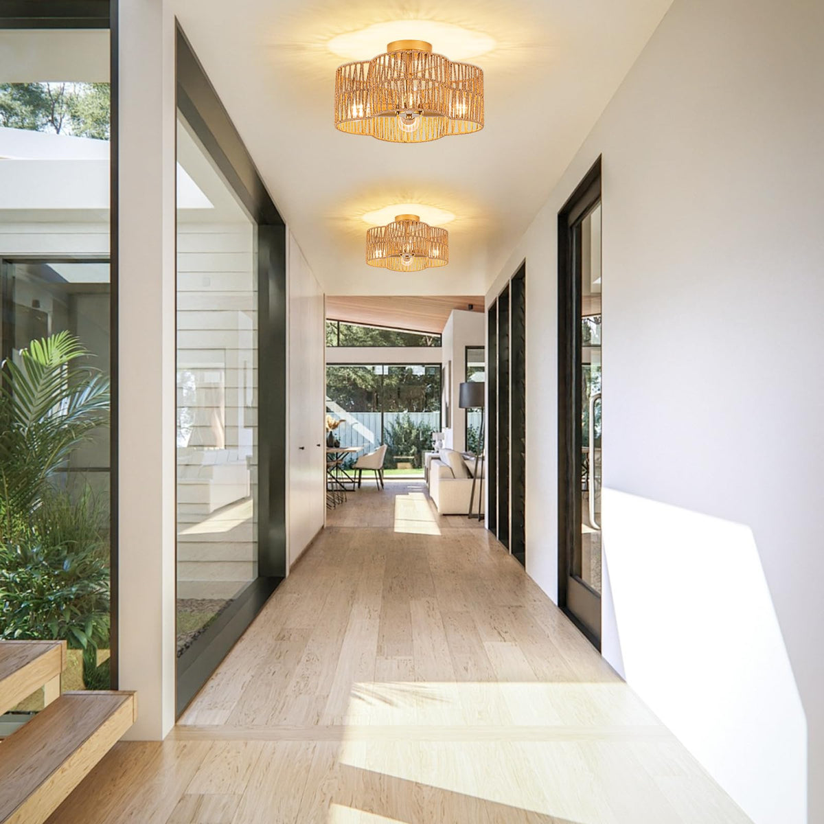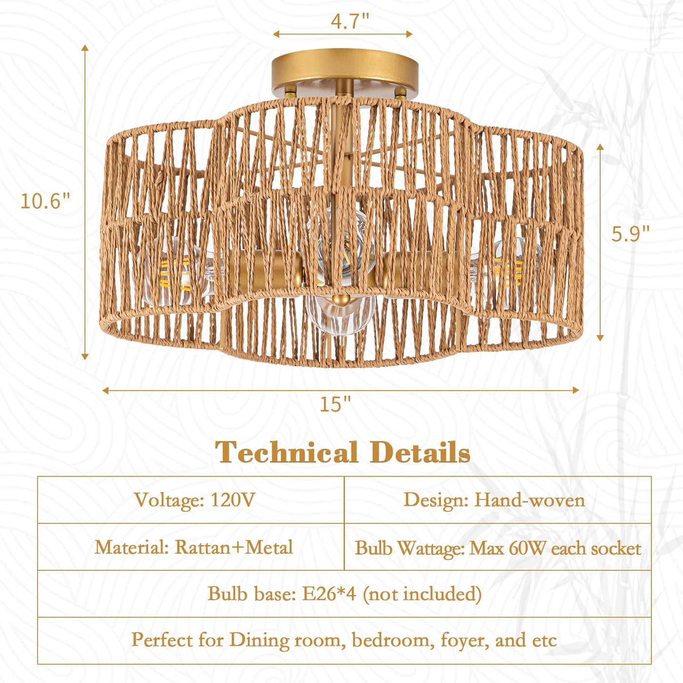 Sytpplan Rattan Light Fixtures Ceiling, 4-Lights Boho Semi Flush Mount Ceiling Light With Hand-Woven Shade, Wicker Light Fixture