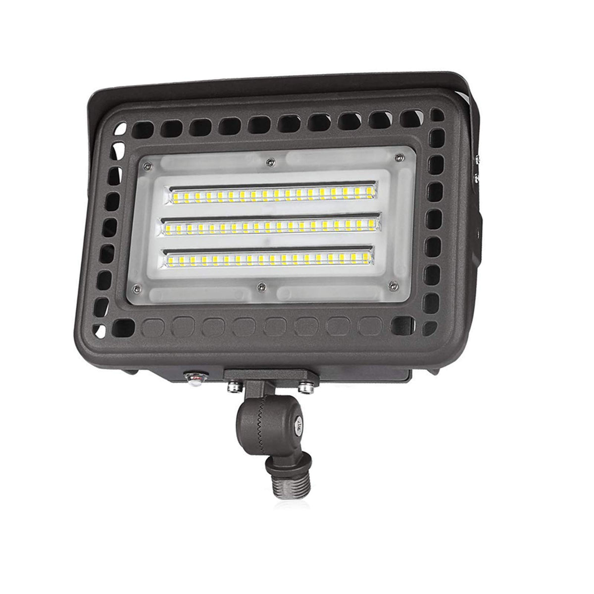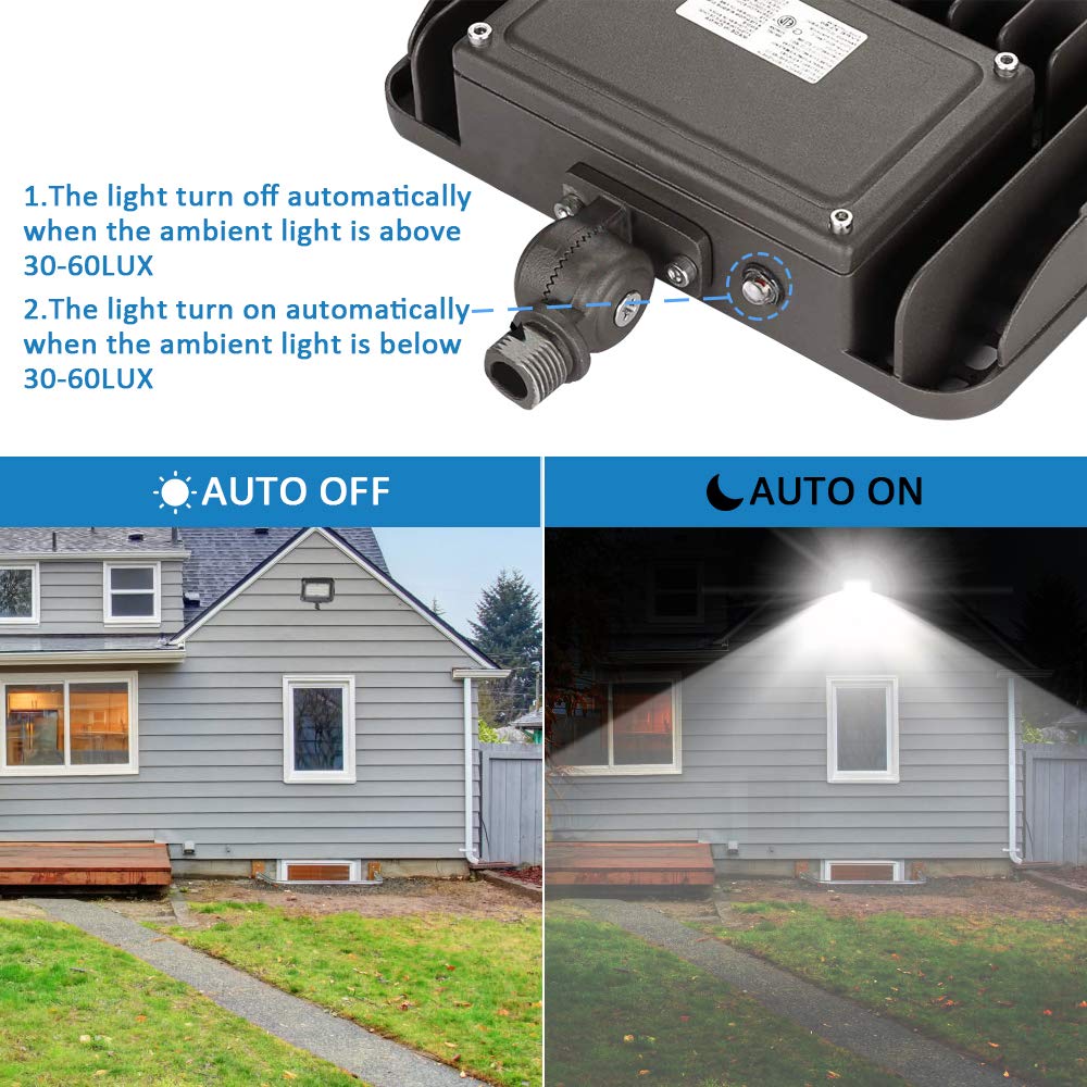 Q: How does the dusk-to-dawn feature work on this flood light?A: The built-in dusk-to-dawn photocell sensor automatically turns the flood light ON at night and OFF during the day, providing hassle-free operation and ensuring your outdoor spaces are well-lit when needed.