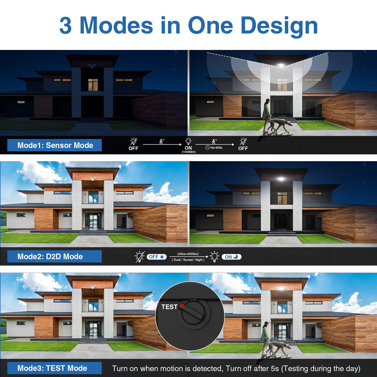 Q: What are the different lighting modes available for this outdoor floodlight?A: The SZPOWER floodlight offers three lighting modes: Sensor Mode (activates on motion detection), Dusk to Dawn Mode (automatically turns on at night), and TEST Mode (checks the sensing function). You can easily switch between these modes based on your needs.