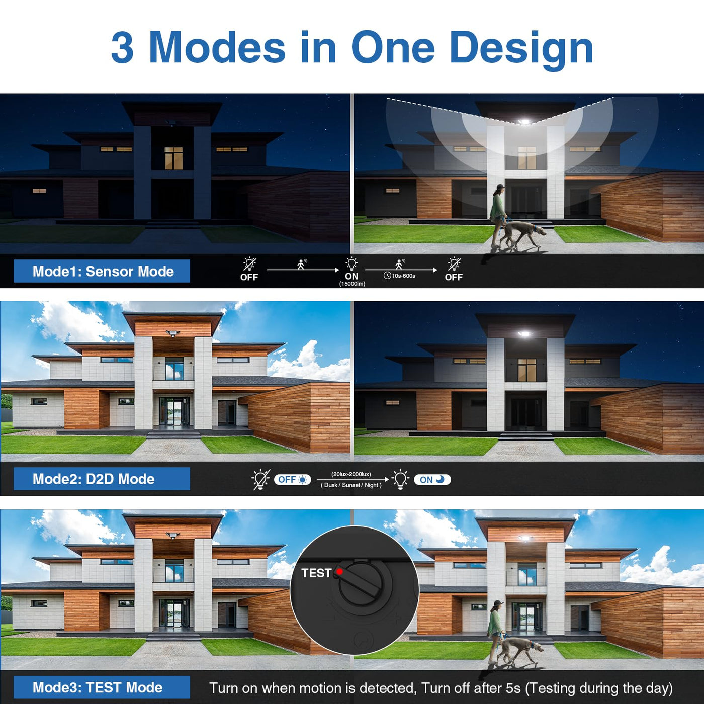 Q: How does the motion sensor work on this outdoor light?A: The motion sensor on the SZPOWER light operates in three modes: Sensor Mode activates the light when motion is detected, Dusk to Dawn mode automatically turns on the light at night and off during the day, and Test Mode turns on the light for 5 seconds upon motion detection for testing purposes.