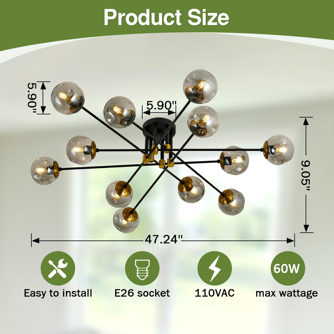 Szxykeji 12 Light Glass Globe Ceiling Light Black Mid Century Flush Mount Sputnik Light Fixture Bubble Chandelier For Living Roo