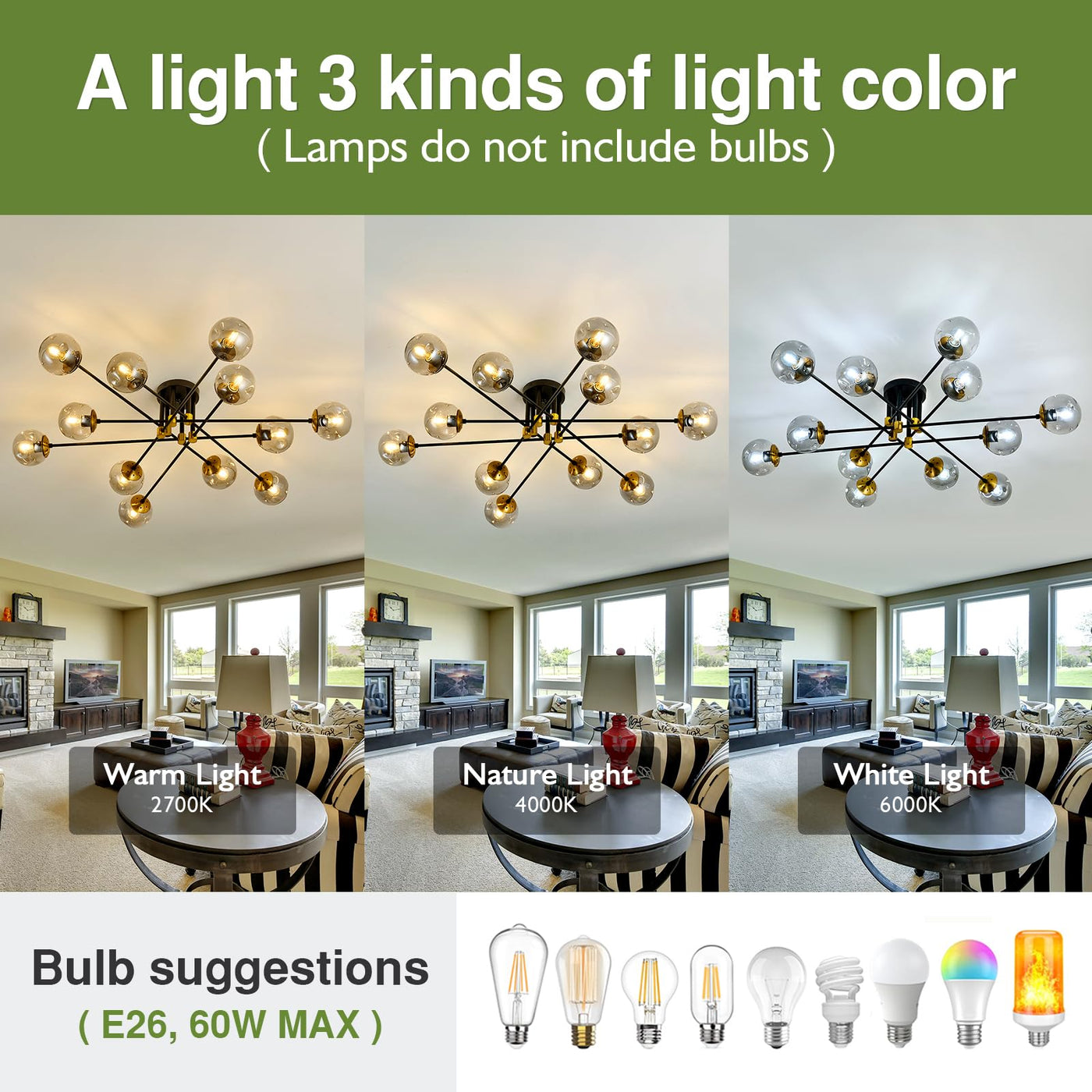 Q: What type of bulbs can I use with the SZXYKEJI 12 Light Glass Globe Ceiling Light?A: The SZXYKEJI ceiling light fixture is compatible with E26 medium base bulbs, including incandescent, LED, CFL, and halogen types. It accommodates bulbs with a maximum wattage of 60W. Please ensure that the bulbs you choose are less than 3 inches in height to fit properly within the lampshade.