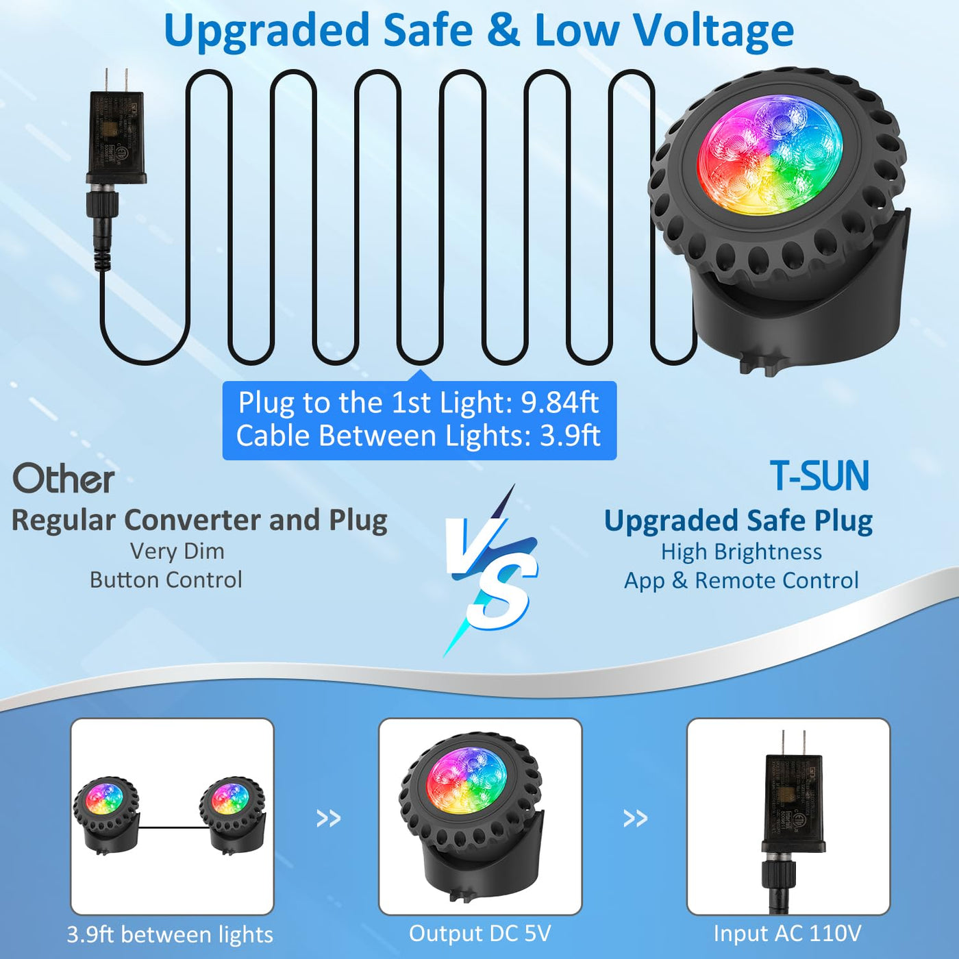 - **Multiple Applications**: Ideal for both in-water and out-of-water use, T-SUN Pond Lights are perfect for illuminating ponds, accentuating fountains, and enhancing landscaping features. They serve as exquisite decorative accessories for aquariums, swimming pools, garden ponds, and waterfalls.