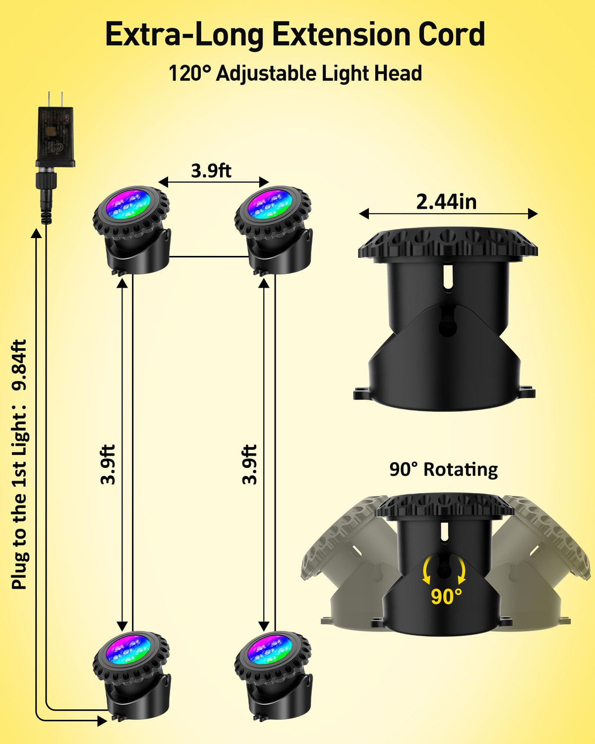 We provide both remote control and smartphone control for the T-SUN RGB LED pond light. Besides providing 16 million colors for do-ityourself applications, outdoor LED color-changing fountain light also provide dynamic modes for music, scenes, and microphone sync. This 6000K white light is always on and is ideal for everyday lighting. It is the ideal seasonal decoration for pond, fish trank, fountain, aquarium, pool, or plant landscape. This multicolored floodlight with an fully sealed housing, IP68 waterproof, and powerful thermal design can function well in rain or snow. I think this will meet your need in many ways. You can dance to the music when you activate the music rhythm feature in the mobile app. It is a pack of 4.