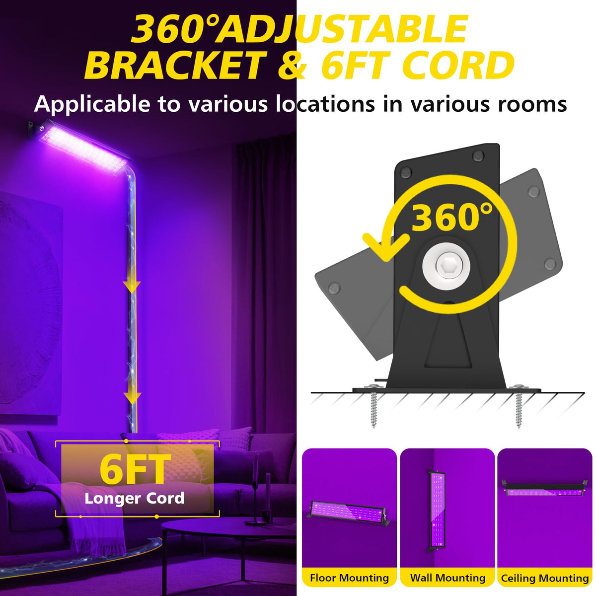 Q: How do I install the T-SUN LED Black Light Bar?A: The T-SUN LED Black Light Bar comes with a six-foot long cord and an on/off switch. It can be easily installed using its adjustable bracket, allowing for wall, floor, or rod mounting.