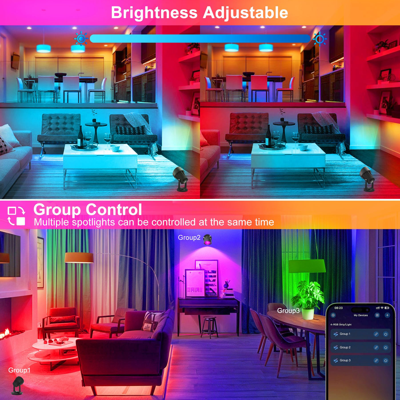 Q: Can the T-SUN RGB Spotlights be used outdoors?A: The T-SUN RGB Spotlights are designed for indoor use and are waterproof; however, the power plug is not waterproof. It is best to use them in dry environments to ensure longevity and proper functioning.