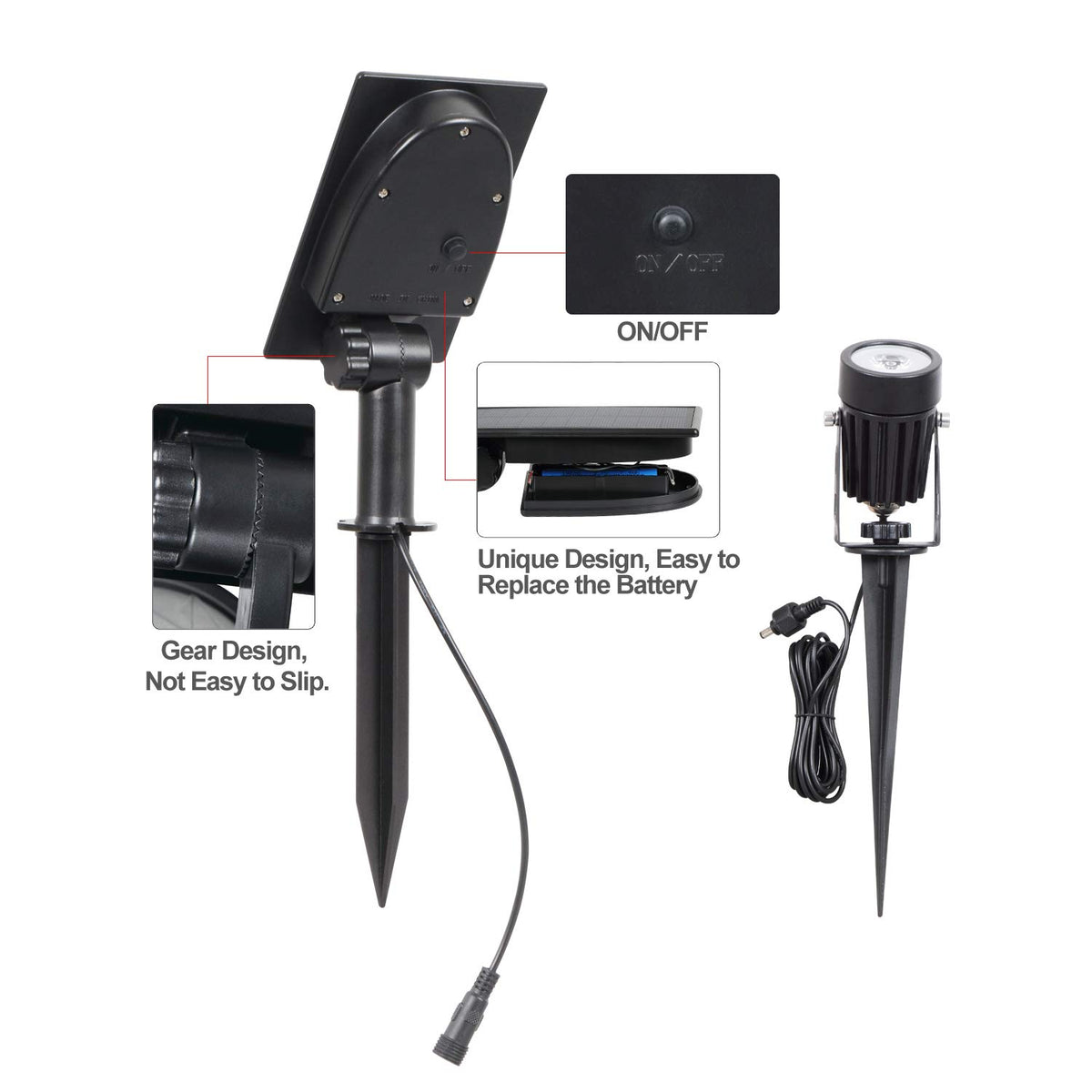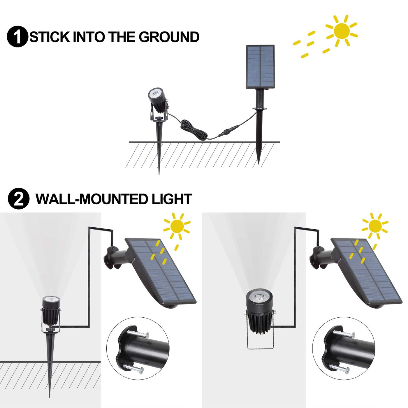 Tips : lease confirm the switch is under AONA status so that the Solar Panel could be charged normally and the Light could be Auto Turn On at Night If the ground is too hard, do not twist or hammer it with force Try to soften the ground with water and then insert into the ground If you have any question with the products, do feel free to contact us Specification : Solar Panel : Poly-crystalline Solar Panel 5V 2WLight Source : 1W high power lamp beads Brightness : 100-120LM Working Hours : 8-12 hours (high light 8H, low light 12H) charging Duration : =8h Function : Light control, the solar panel charges the battery during the day and lights automatically at night Waterproof rating : IP65 Extension line : 3 Meters Material : ABS + cast Aluminum Shell color: Black Package Included 1 x Solar Spotlights 1 x User Manual 2 x Spike 3 x Expanding rubber plugs 3 x Screws