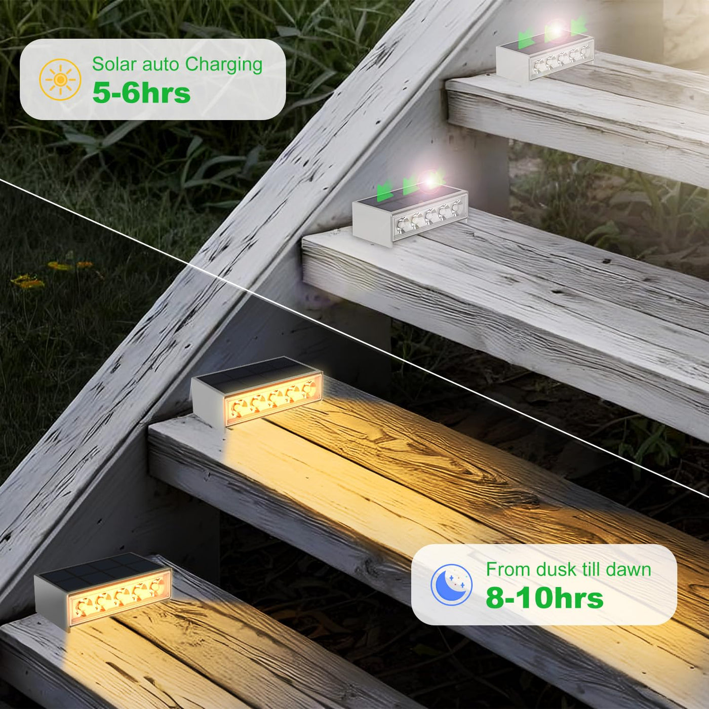 Q: What color light do the T-SUN Solar Step Lights emit?A: These solar step lights emit a warm white light at 3000K, creating a cozy and inviting ambiance for outdoor spaces like patios and stairways.