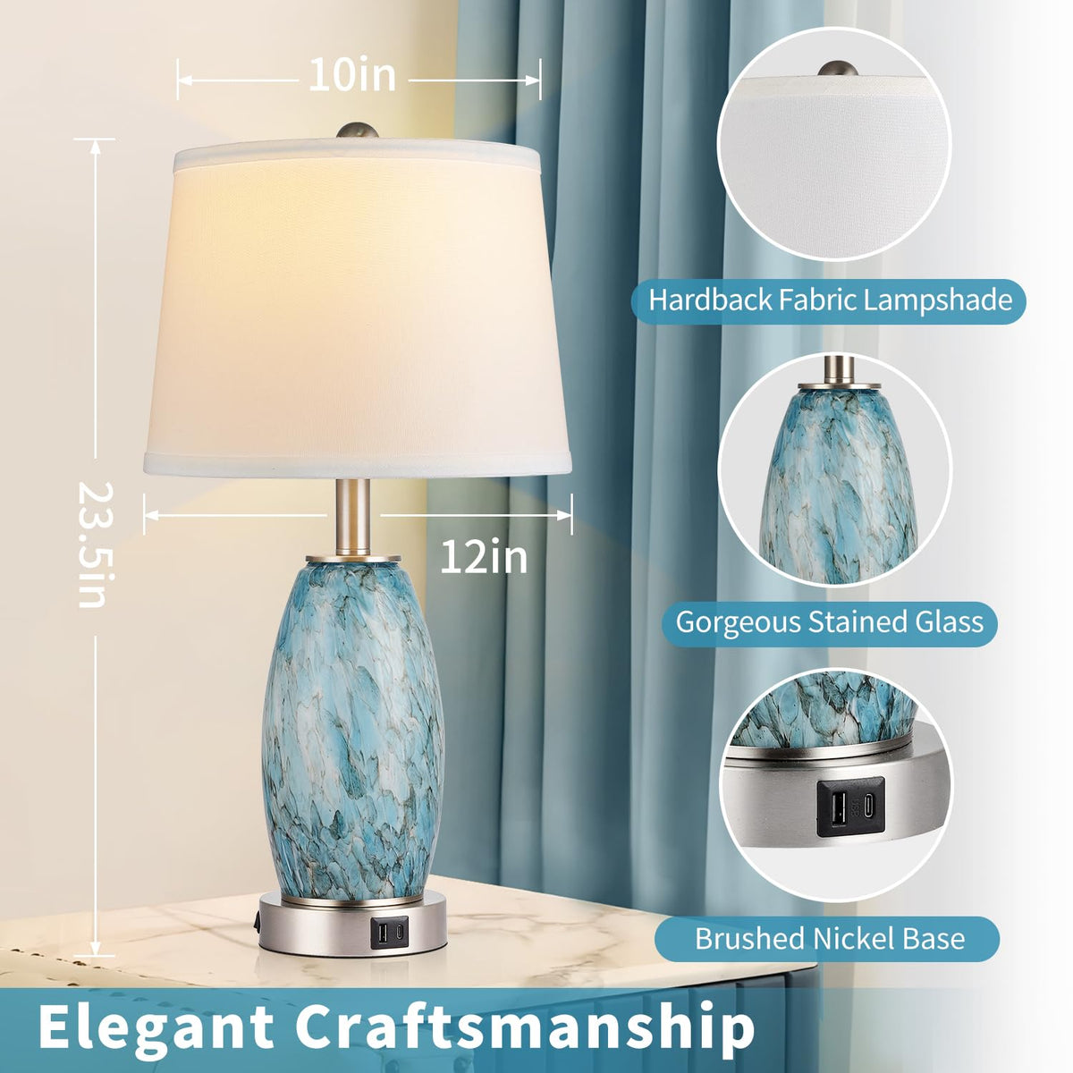 Elegant Modern Style: Blending natural elements with modern design, this coastal lamp draws inspiration from coastal lifestyles, combining blue textured glass with a high-quality metal base to exude sophistication and modernity. The modern table lamp shade is made of soft fabric that emits a warm and inviting glow when illuminated. This bedside table lamp effortlessly captures the essence of coastal modern style. | 3 Way Lighting Modes: The table lamp for bedrooms is adjustable with knobs and buttons. You can choose to light the top of table lamp, or the middle of table lamp, or both at the same time, according to your lighting needs. If you only have the middle of bedroom lamp on, this is the night light mode we set, the soft light makes it easier for you to fall asleep. This would be great nightstand lamp. | Convenient Type C & USB Charging Port: Each side table lamp have 1 USB charging port and 1 type C charging port (5V/2.1A) on the base. After connecting the power cord, you can quickly charge mobile phones, tablets, laptops and other electronic devices regardless of whether the end table lamps are on or off. The bedroom lamp can not only meet your lighting needs, but also make your desktop more tidy and orderly. | Quality First: The bedside lamp features 1 energy-saving LED bulbs with no flickering or buzzing. This bedroom lamp has undergone 40 stages of exquisite craftsmanship and 15 stages of meticulous polishing. Our pursuit of detail and high quality starts at the source, ensuring you receive a high-quality table lamp. This living room lamps is definitely the perfect addition to your bedroom, office, or living room. | Easy Installation & Excellent Service: Our bedroom lamp for nightstand come with installation instructions and can be installed in just a few steps. Lovlast adheres to the concept of ''quality first'', if there are any problems with the lamp for bedrooms, please contact us in time, we will provide you with the best solution within 24 hours.