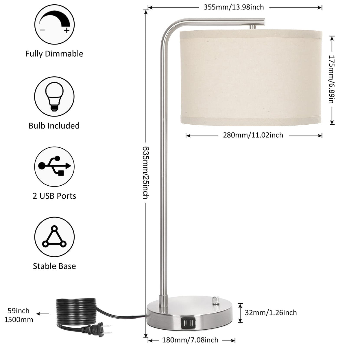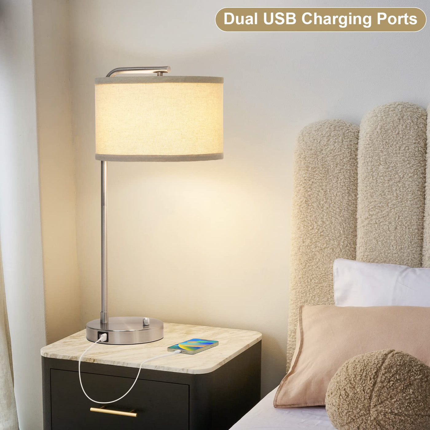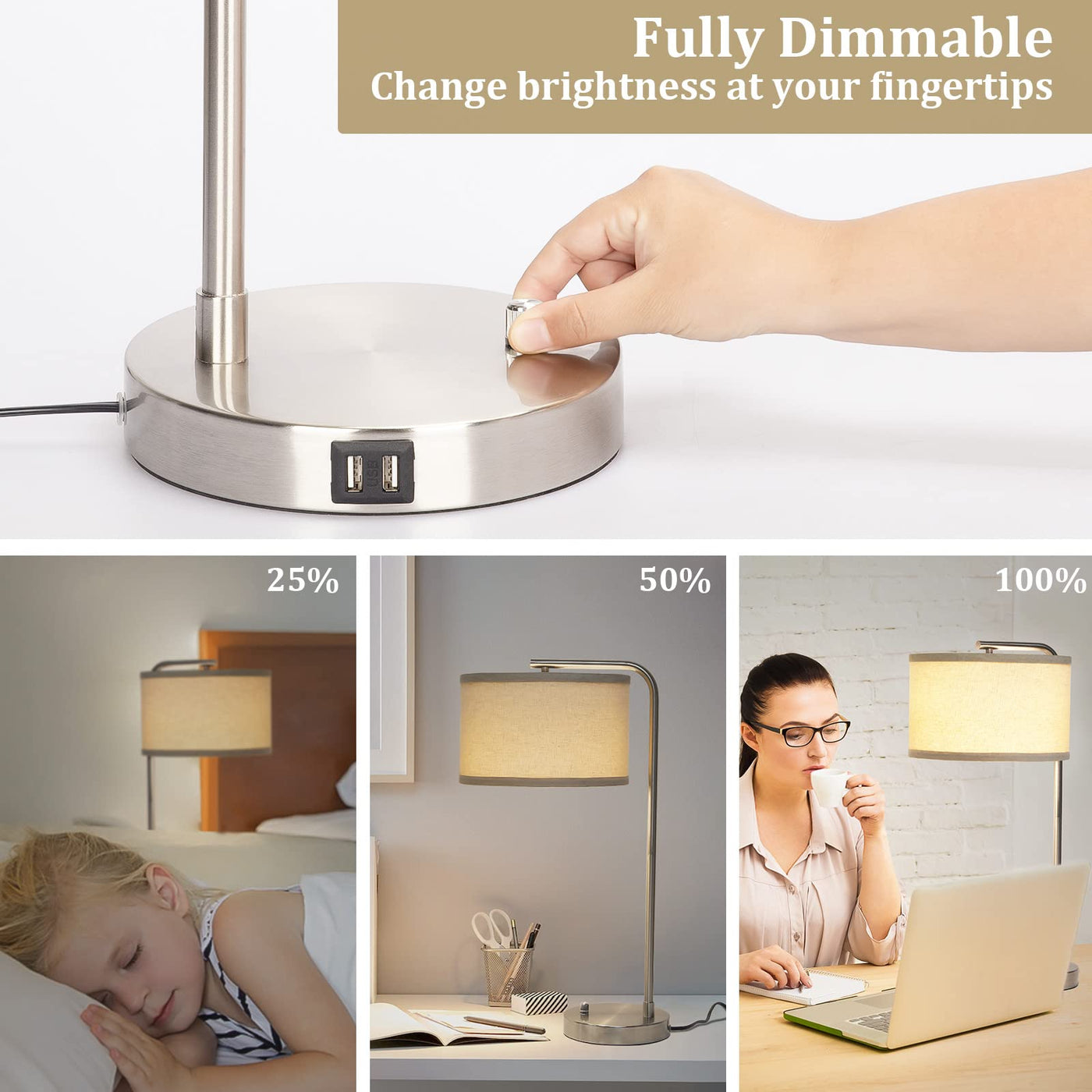 With A Dimming Switch Located At The Bottom Of This Table Reading Lamp, Its Brightess Can Be Set From 0 To 100% For Different Occassions. Built-In Dual Usb Ports Save You From The Trouble Of Fumbling With Chargers To Juice Up Your Phone, Greatly Facilitate Your Life As A Bedside Lamp.