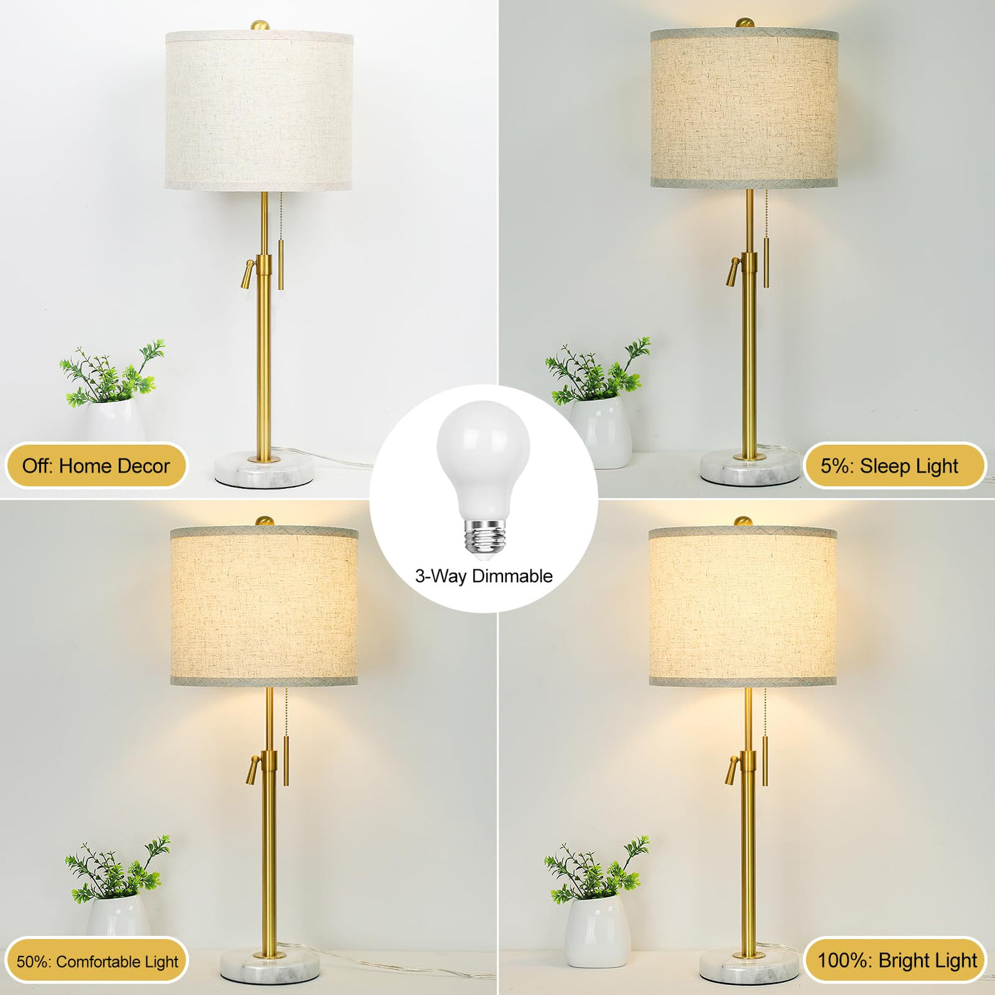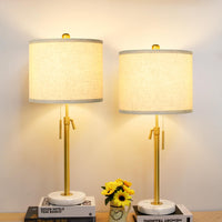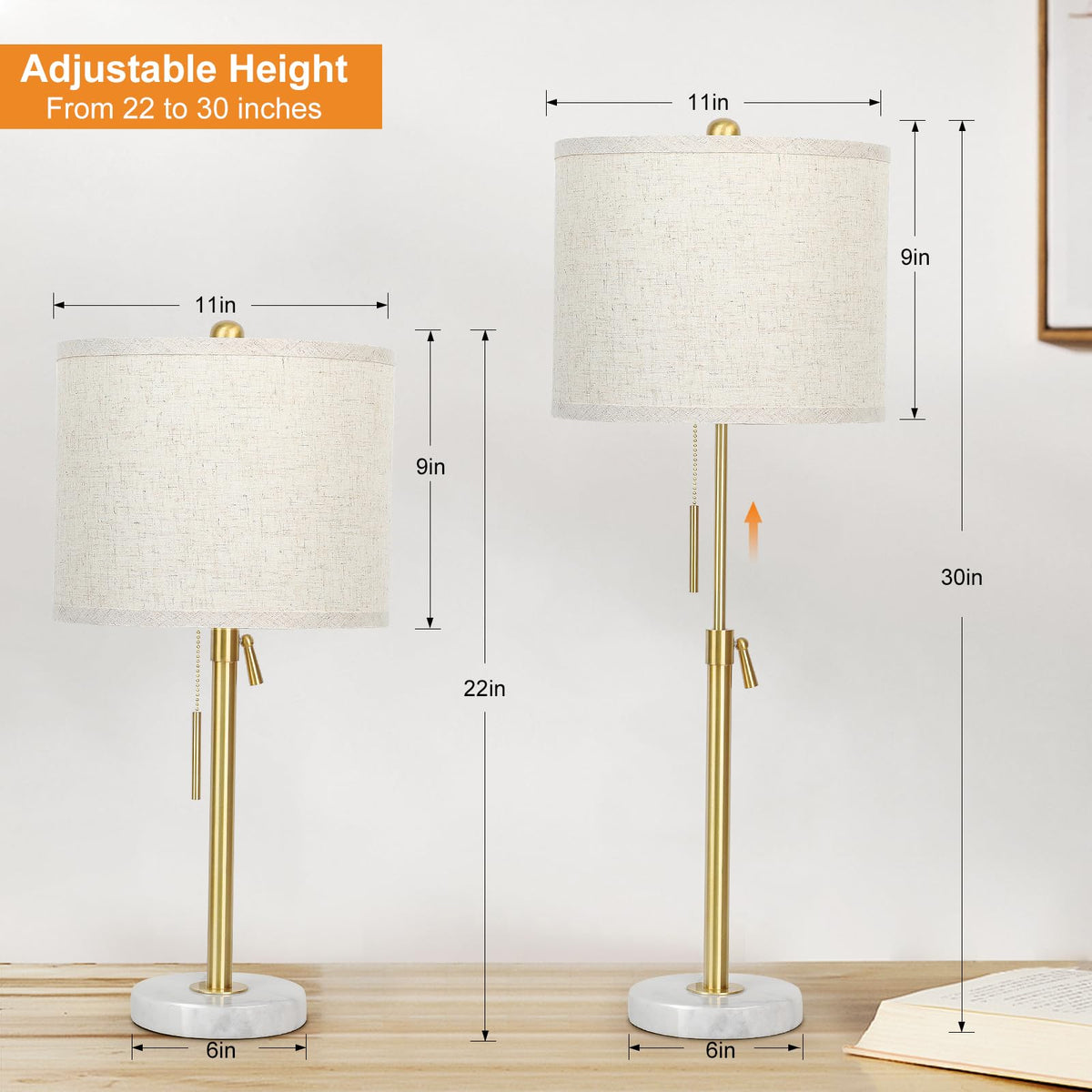 Table Lamp Set Of 2: 22'' To 30'' Height Adjustable Pull Chain Switch For Living Room Bedroom End Table, Marble Base Beige Linen