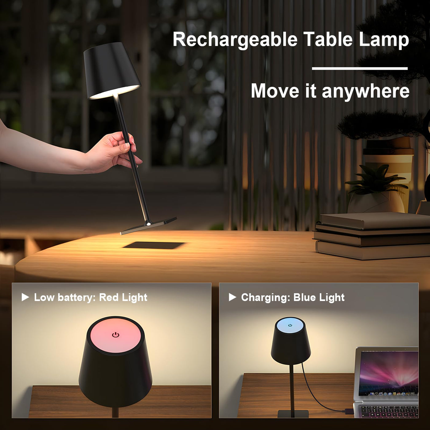 Table Lamp Set of 2, Mojimdo Cordless Desk Lamp 64 LEDs Dimmable [1700K/4500K/6000K with Stepless] Rechargeable Portable Table Light for Living Room Kids Bedroom Camping Outdoor Party Cafe Bar - Black