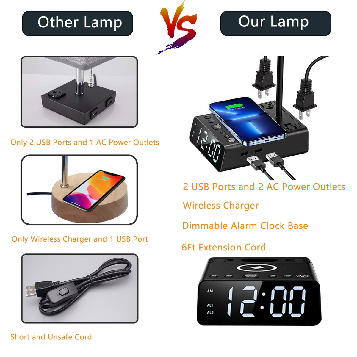 Do You Find It Troublesome Spending Extra Time Looking for a Socket to Meet Your Charging Needs? Are you troubled by the prezzie for picking to friends and family? Are you looking for a table lamp you want to decorate your room with? No need to be tangled. Our touch bench lamp can not only charge multiple devices (the table lamp socket needs to be opened), but also create a romantic and warm atmosphere for your room while lighting. (1)Convenient Wireless Charger & Dual USB Charging Ports & 2 AC Outlets Nightstand lamp is able to charge up to 4 electronic devices at the same time, such as smart phone, iPad whether the usb lamp is on or off! (2)Dimming Bedside Lamp with charging station for Bedroom No longer deal with difficult switches or tangled cords, this small table lamp can be turned on by touching the light bulb symbol on the base and the brightness can be adjusted. Low brightness: Wind down for sleep or baby nursing; Medium brightness: Watching videos or using phones; High brightness: Lighting light for reading or working; Our 3-way dimmable table lamp topped with fabric shade, defend your eye from direct illumination. Eye-caring safer choice for your baby room, reading room. Its modern industrial style shows up gorgeous decor in living room, bedroom, nightstand, table. (3)Alarm Clock These are bedside lamps with alarm clock that can be set with two sets of alarm functions, 3 adjustable brightness, 9 minute snooze, on/off switch and large digital display. (4) Touch Lamp This small table lamp can be turned on by touching the light bulb symbol on the base, the wireless charging lamp has 3 different lighting options, you can adjust the light level according to your needs,the shade can soften the light, which can protect your eyes. (5)Good prezzie Best festival prezzie for kids, friends and family. Different from most bedside lamps on the market, our bedside lamp not only has wireless charging function, but also offers you 2 USB charging and 2 AC Outlets