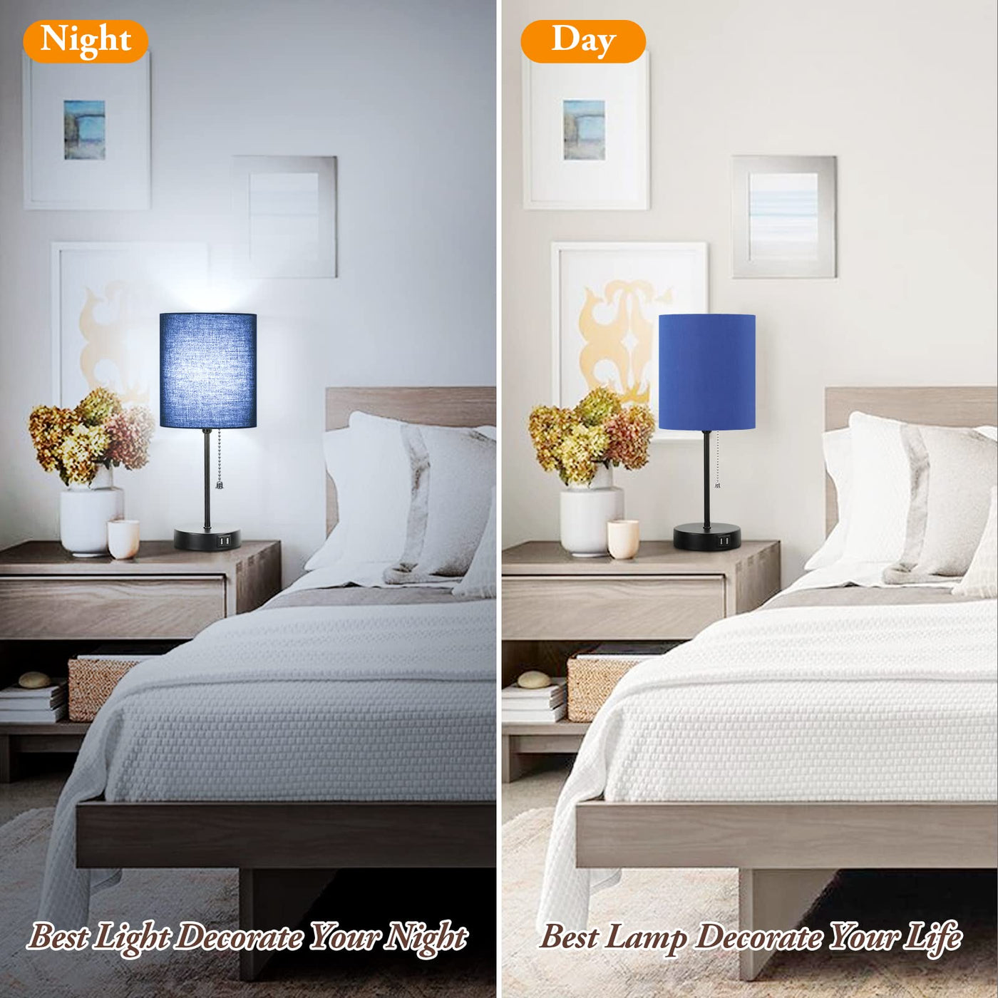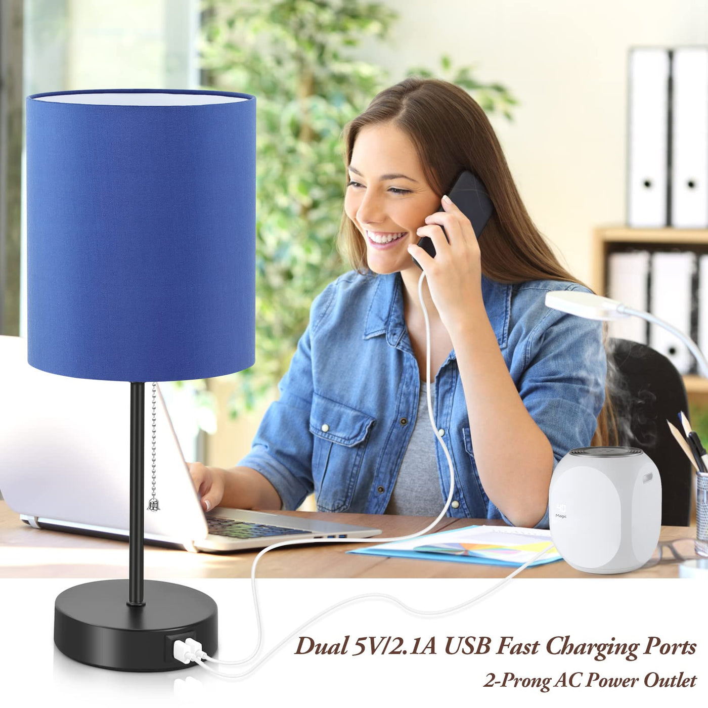 Table Lamps Set Of 2 With Usb Charging Ports, Blue Bedside Lamps With Ac Outlet, Nightstand Lamps With Pull Chain Switch, Minima