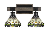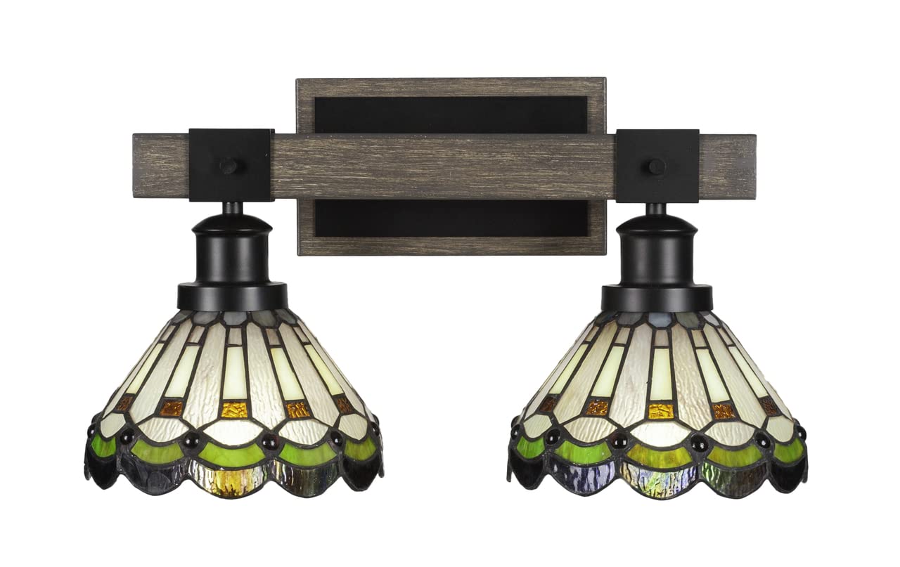 Collection: Tacoma, Material: Steel, Finish Color: Black/Painted Wood, Height: 10", Length: 17.5", Depth: 7.75", Backplate Width: 7.75", Backplate Length: 4.5", Lamping Type: Incandescent, Number Of Bulbs: 2, Wattage: 100 Watts, Dimmable: No, Moisture Rating: Damp Rated, Desc: Tacoma 2 Light Bath Bar In Matte Black & Painted Distressed Wood-look Metal With 7? Cyprus Art Glass,