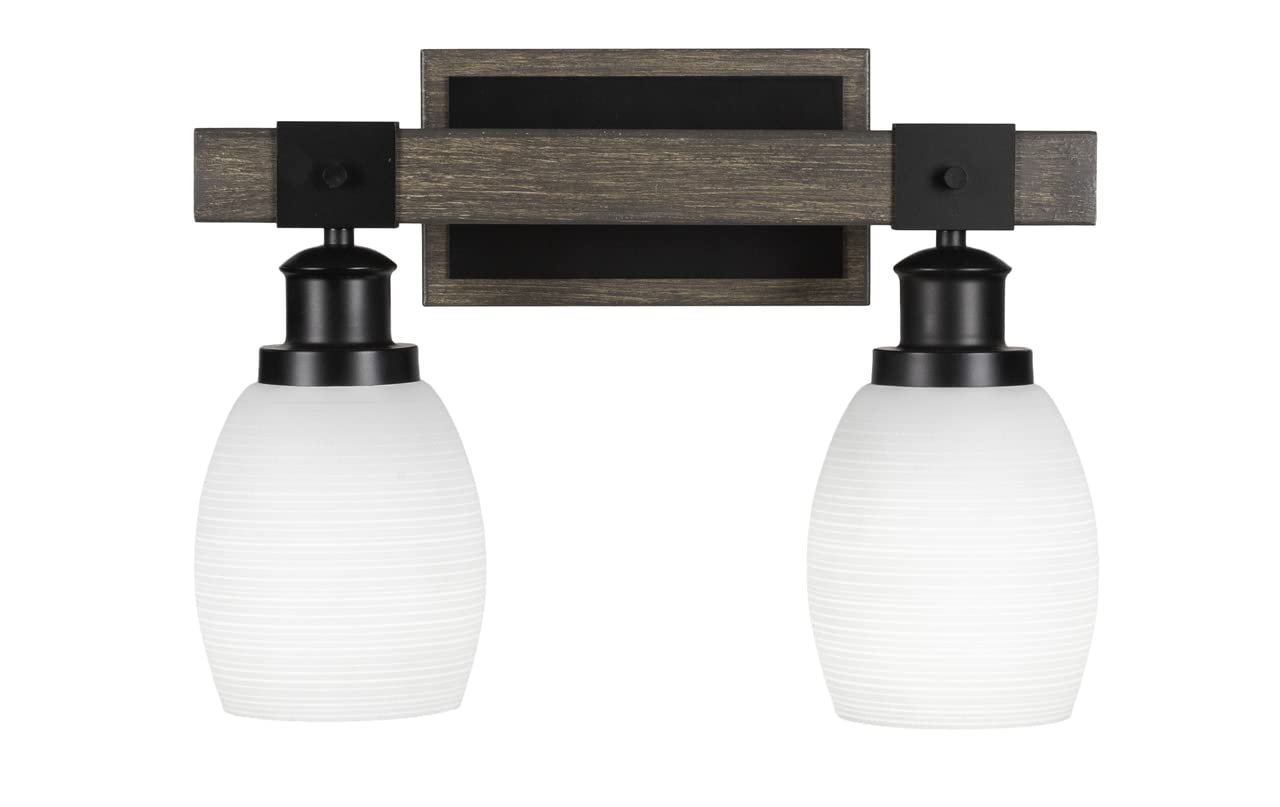 Tacoma 2 Light Bath Bar In Matte Black & Painted Distressed Wood-look Metal With 5" White Matrix Glass