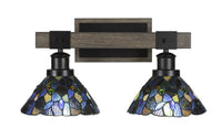 Collection: Tacoma, Material: Steel, Finish Color: Black/Painted Wood, Height: 9.25", Length: 17.75", Depth: 8", Backplate Width: 7.75", Backplate Length: 4.5", Lamping Type: Incandescent, Number Of Bulbs: 2, Wattage: 100 Watts, Moisture Rating: Damp Rated, Desc: Tacoma 2 Light Bath Bar In Matte Black & Painted Distressed Wood-look Metal With 7? Blue Mosaic Art Glass,