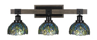 Tacoma 3 Light Bath Bar In Matte Black & Painted Distressed Wood-look Metal With 7" Turquoise Cypress Art Glass