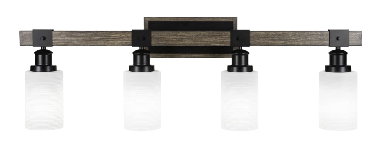 Collection: Tacoma, Material: Steel, Finish Color: Black/Painted Wood, Height: 11.75", Length: 35.5", Depth: 6", Backplate Width: 10", Backplate Length: 4.5", Lamping Type: Incandescent, Number Of Bulbs: 4, Wattage: 100 Watts, Dimmable: No, Moisture Rating: Damp Rated, Desc: Tacoma 4 Light Bath Bar In Matte Black & Painted Distressed Wood-look Metal With 4? White Matrix Glass,