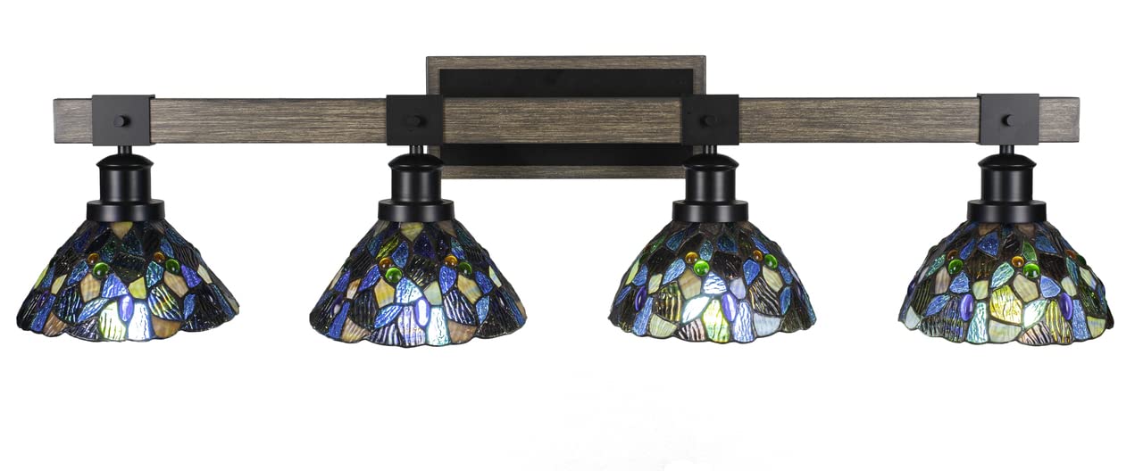 Collection: Tacoma, Material: Steel, Finish Color: Black/Painted Wood, Height: 9.25", Length: 38.5", Depth: 8", Backplate Width: 10", Backplate Length: 4.5", Lamping Type: Incandescent, Number Of Bulbs: 4, Wattage: 100 Watts, Moisture Rating: Damp Rated, Desc: Tacoma 4 Light Bath Bar In Matte Black & Painted Distressed Wood-look Metal With 7? Blue Mosaic Art Glass,