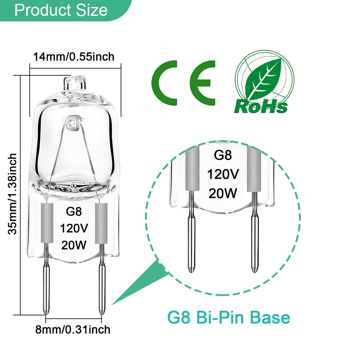 Q: How do I ensure I am purchasing the correct bulb for my light fixture?A: To ensure you are buying the correct bulb, verify that your light fixture requires a G8 2-Pin Bi-Pin base with an 8mm pin distance, as it can be easily confused with the similar-looking G4 bulbs that have a smaller 4mm pin distance.