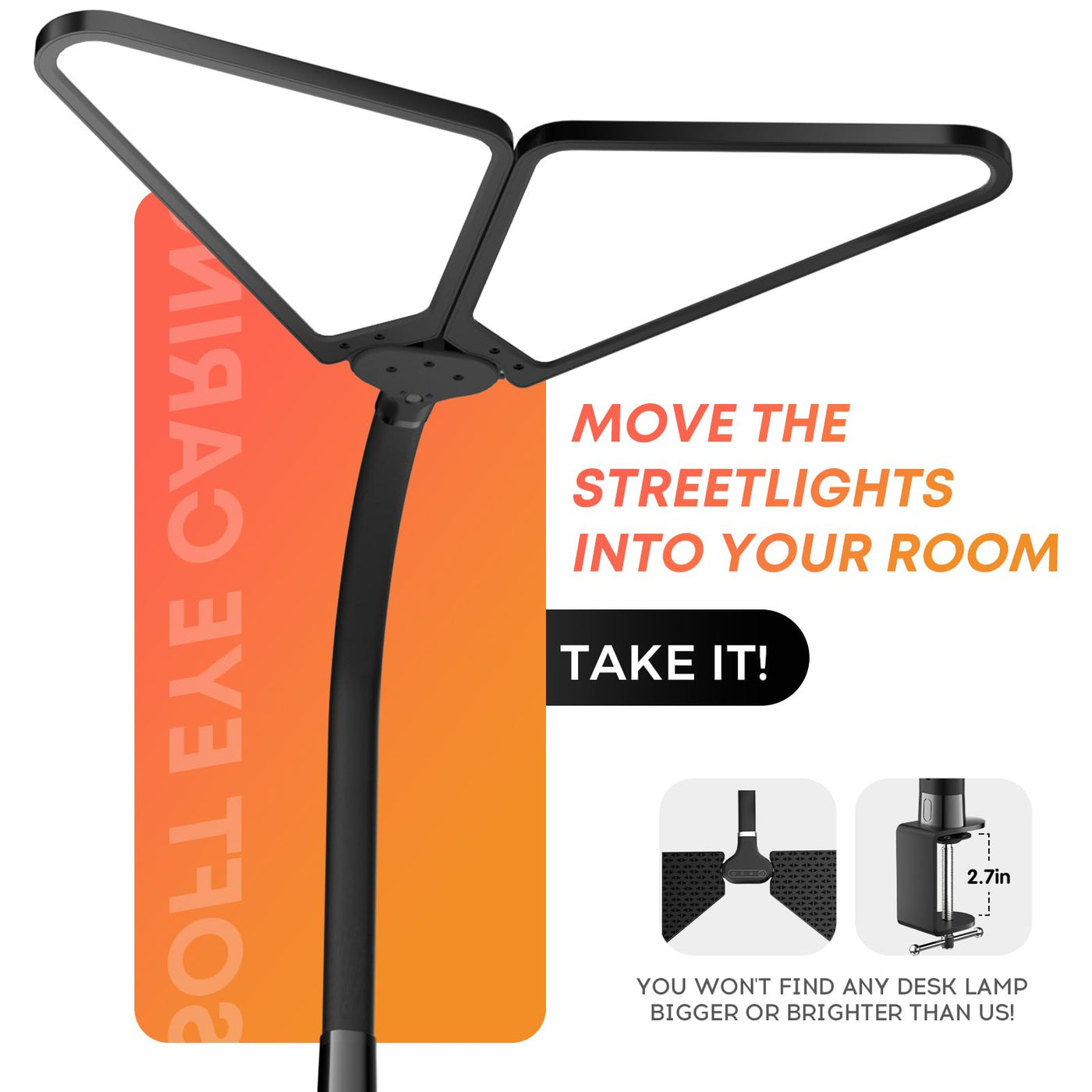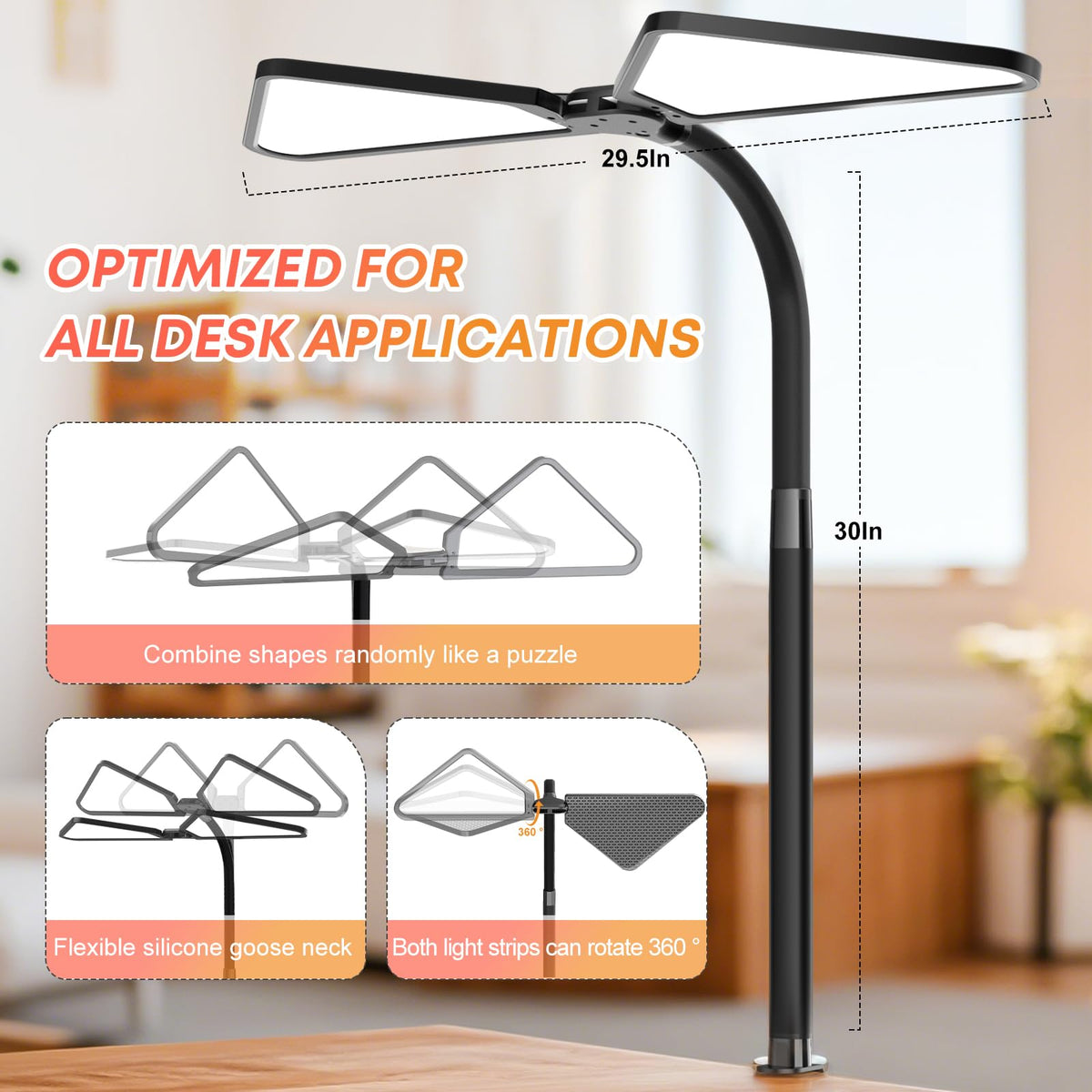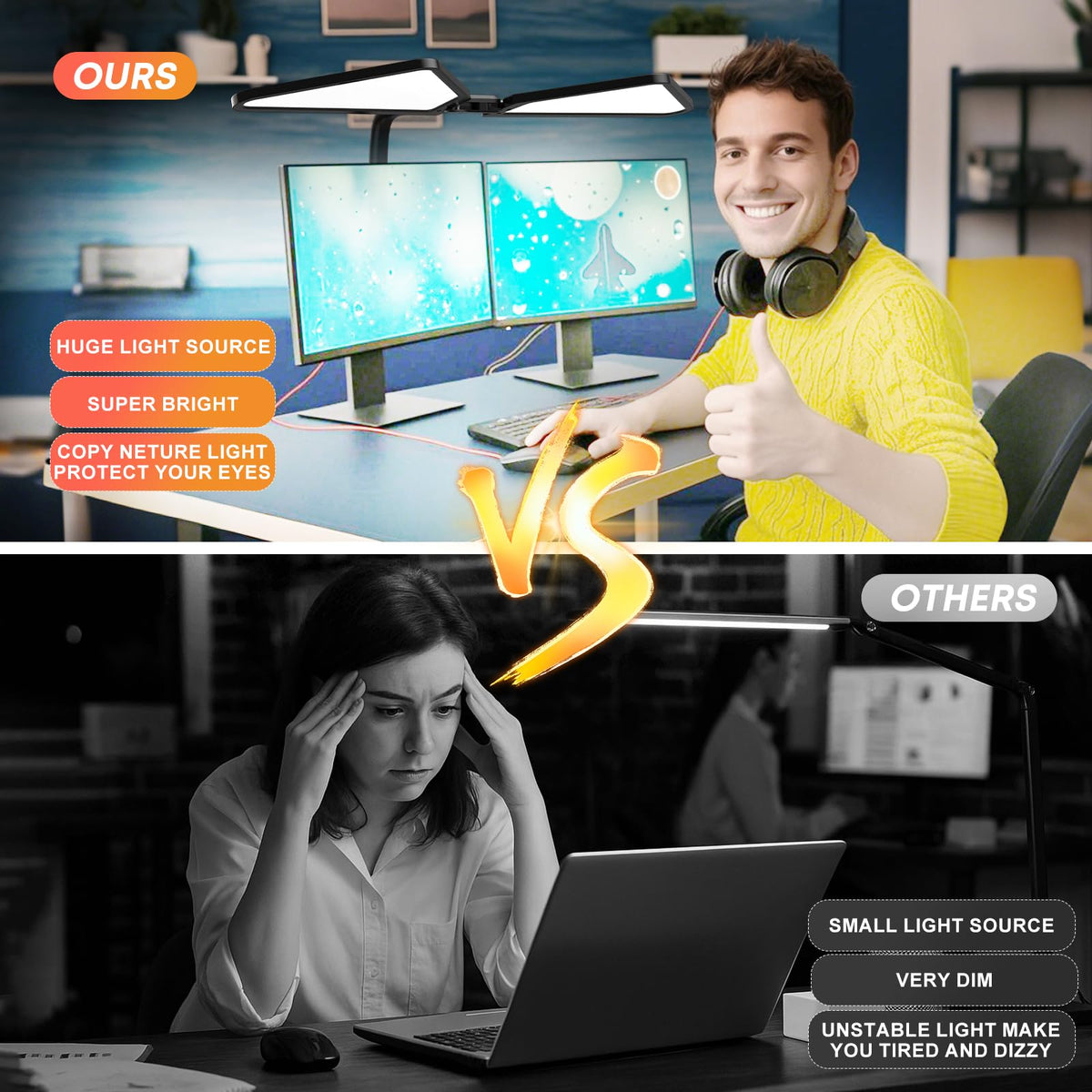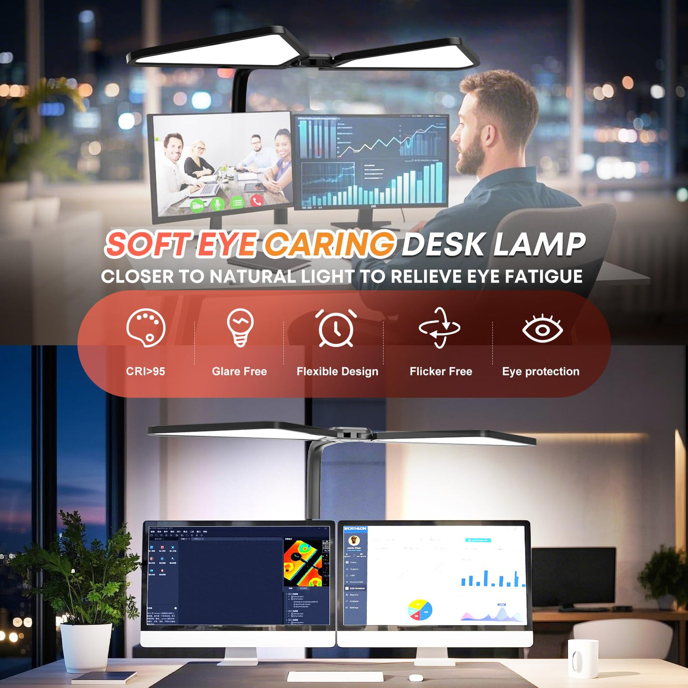 EXCELLENT MATERIALS AND MULTI ANGLE ADJUSTMENT - Our LED Desk Lamp is made of high quality materials to ensure durability and safety. The triangular shape of the light source is not only stylish and modern, but both light sources can be rotated 360 and each can be adjusted to 90 independently, allowing you to adjust the direction of the light as you wish to meet the lighting needs of different scenarios. MULTI-PURPOSE LIGHTING SPECIALIST - This Screen Monitor Light is not only ideal for illuminating your computer screen, but also for reading, drawing and working. Whether you are working during the day or studying at night, it provides a steady, even light that reduces eye fatigue. ADAPTABLE TO A VARIETY OF SCENARIOS - Whether you're focusing on work in the office, enjoying reading during breaks, or even studying, this LED Desk Light is your ideal companion. Its portability and versatility make it perfect for home, school and workplace. EYE PROTECTIVE LIGHTING WITH COMFORTABLE ADJUSTMENT - We understand the importance of eye health, so this desk lamp is specially designed with 4 color temperatures and 5 brightness adjustments to minimize eye damage and provide the most comfortable lighting experience. Protect your eyesight whether you are working or resting. EFFICIENT LIGHTING, BRIGHTNESS UPGRADE - Equipped with high efficiency LED light source, this desk lamp can provide brighter lighting effect and cover a larger lighting area. Whether you are doing detailed drawing or need to concentrate on your work, it can meet your needs for brightness and make your every use more efficient.