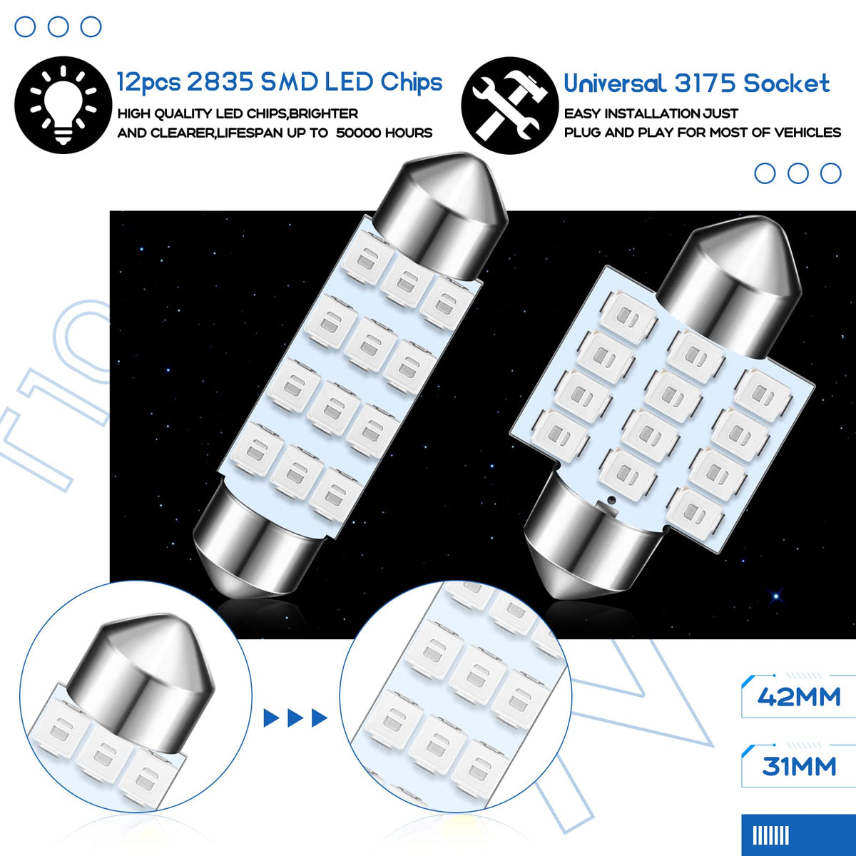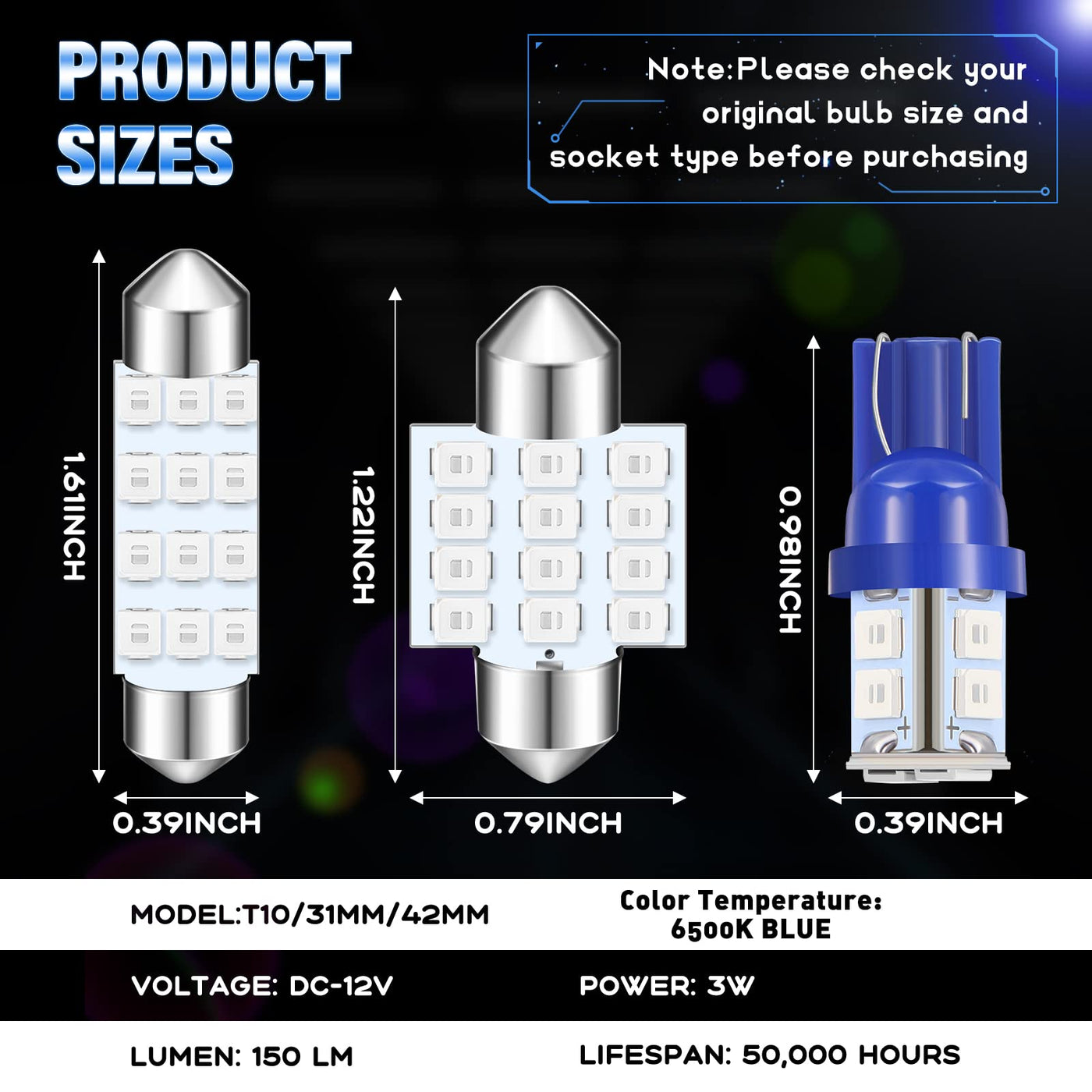 Features: Practical gifts to express love and care: You can choose the LED dome light bulbs as considerate gifts on Christmas, Halloween, Thanksgiving, birthdays or other festivals, expressing your love and care for your friends or family members who own cars. The LED interior bulbs can light up the dark environments they are in, making their driving more comfortable and relaxed. Suitable for most auto vehicles: The dome interior lights can be applied to most auto vehicles, such as pickups, SUV, trunks, tractors, trailers and more. You can also install the interior overhead car lights on your Christmas tree, wreaths, doors, walls, holiday backdrops and more, creating a festive and peaceful atmosphere on holidays. Specifications: Material: PC, LED Color of light: as pictures show Size: 10 Lights bulbs: approx. 25 x 10 mm/ 0.98 x 0.39 inches 12 Lights bulbs: approx. 31 x 20 mm/ 1.22 x 0.79 inches and approx. 41 x 10 mm/ 1.61 x 0.39 inches (2 types) Package includes: 24 x LED dome lights Notes: Manual measurement, please allow slight errors on size. The color may exist a slight difference due to different screen displays. Please check the size of your socket carefully before ordering. Please be careful when you install the bulbs to get the correct polarity.