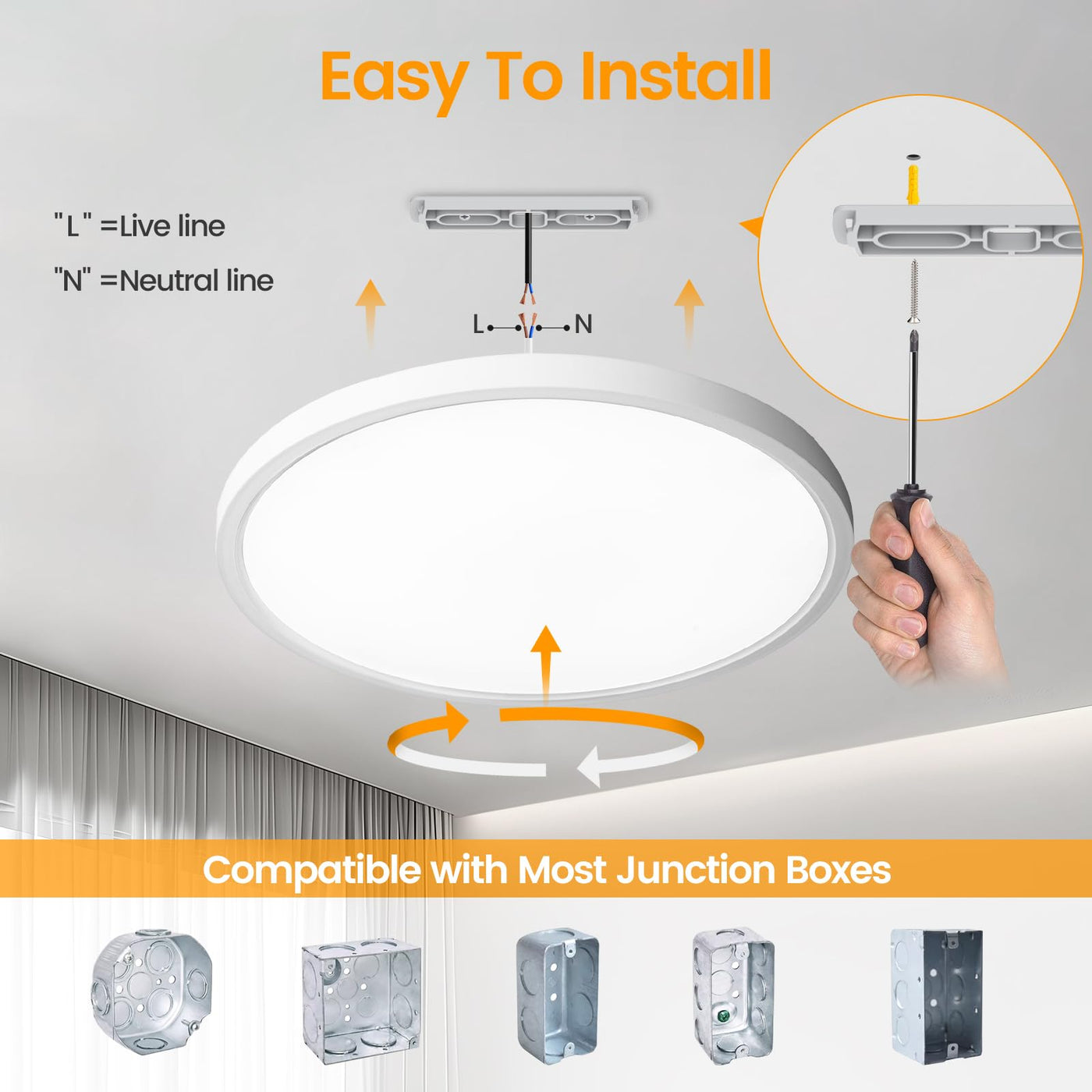 Product Features: Ultra-thin design, only 0.94 inches: Slim body, close to the ceiling, reducing the sense of space oppression, more modern and minimalist. 12-inch round, classic and versatile: Simple round design, easily integrated into various home styles. 5000K natural white light, bright and comfortable: Close to natural light color temperature, providing a bright and comfortable lighting environment, protecting eyesight and enhancing the texture of space. Single color, non-dimmable, simple and easy to use: No complicated operation, switch to control the light, convenient and fast. Applicable Scenarios: Bedrooms, living rooms, dining rooms,Corridors, kitchens, balconies,Offices, shops Let this ultra-thin ceiling light illuminate your simple and comfortable living space!