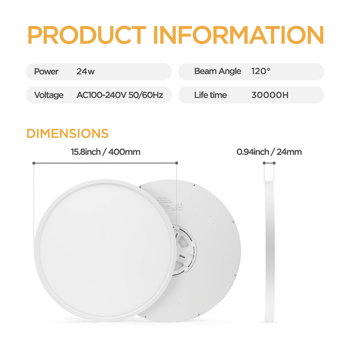 Q: What safety features does the TALOYA LED Ceiling Light have?A: The TALOYA LED Ceiling Light includes absolute electric insulation and a fire-resistant plastic shell to minimize the risk of electric shock and potential fire hazards.