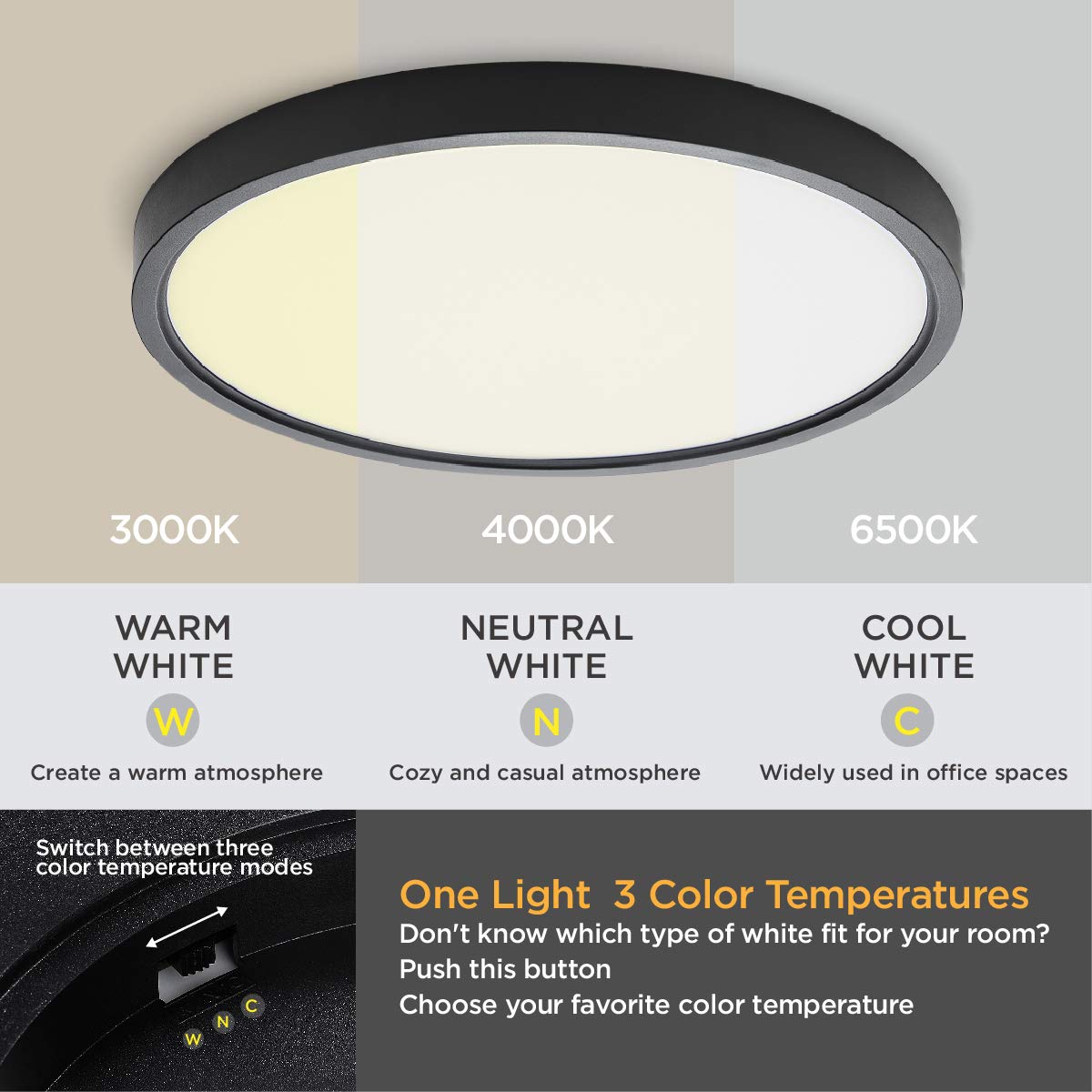Q: What are the available color temperatures for this ceiling light?A: This ceiling light offers three color temperature options: 3000K warm white, 4000K natural white, and 6500K daylight, allowing you to choose the lighting that best fits your space.