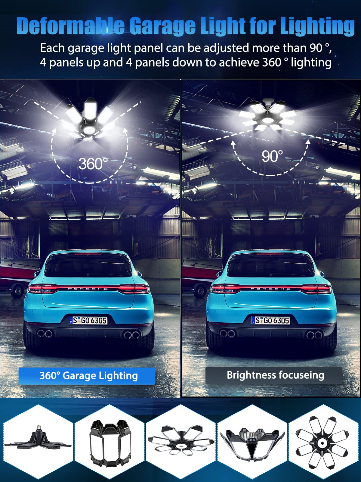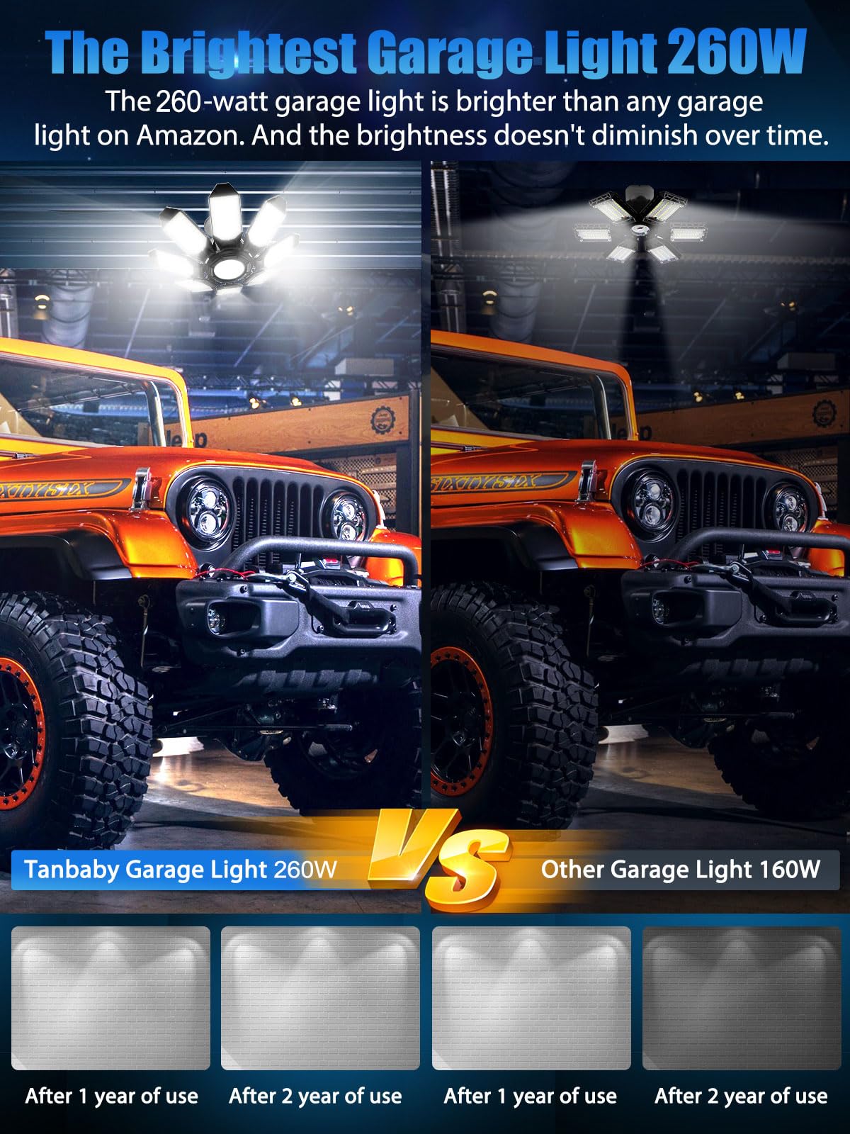 TANBABY 260W LED Garage Lights 2 Pack, Total 52000LM Deformable Best Garage Light Ceiling LED Shop Lights, E26/E27 Screw in LED Light Garage Lighting with 8+1 Panels Garage Bulb for Basement, Attic