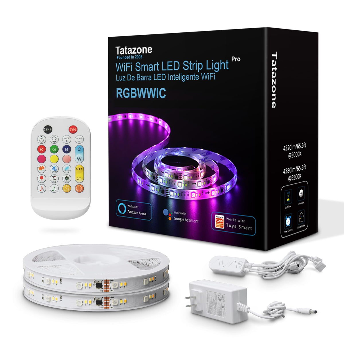 Tatazone 65.6Ft Rgbww Wifi Smart Led Strip Light, Color Changing, Music Sync, Compatible With Alexa