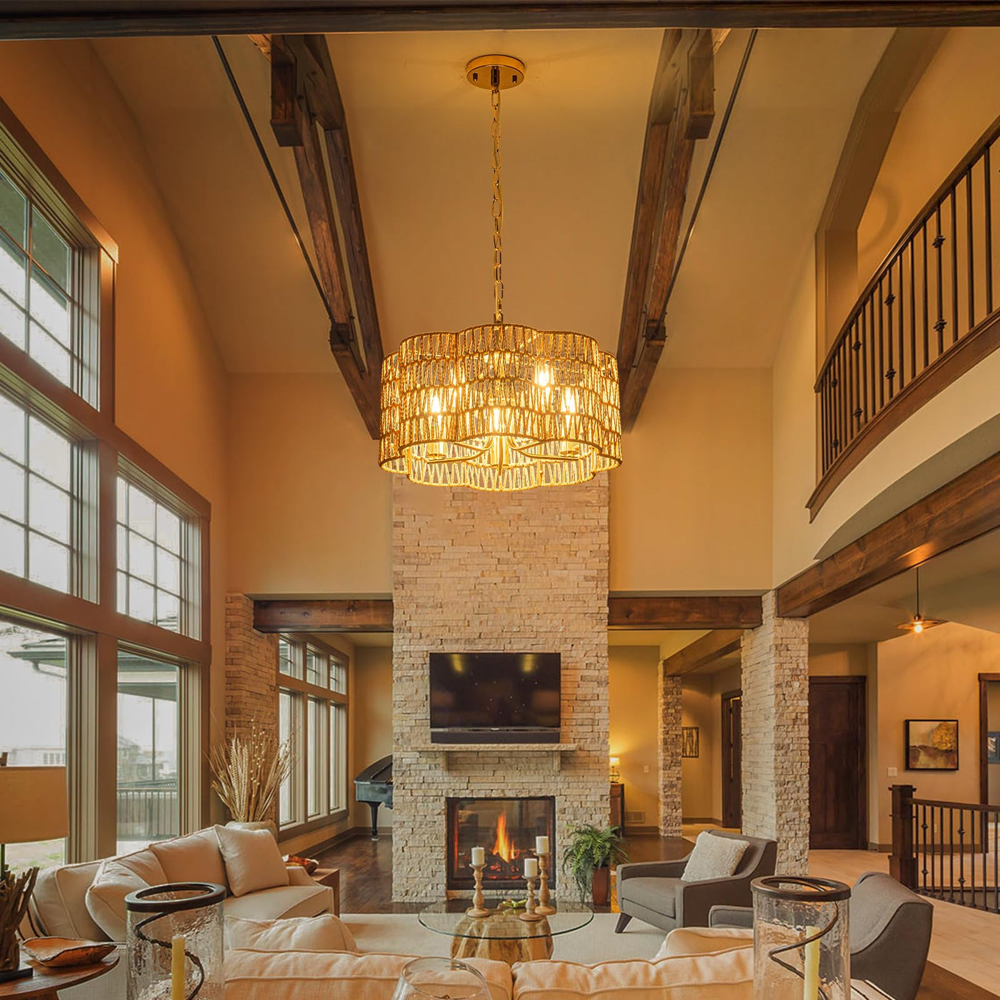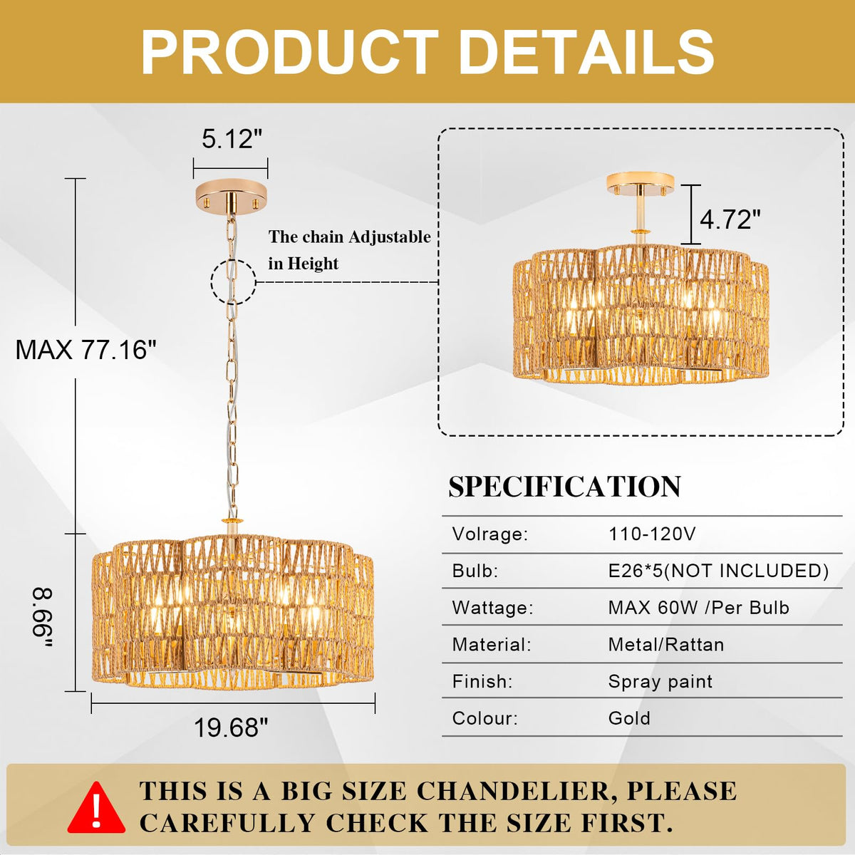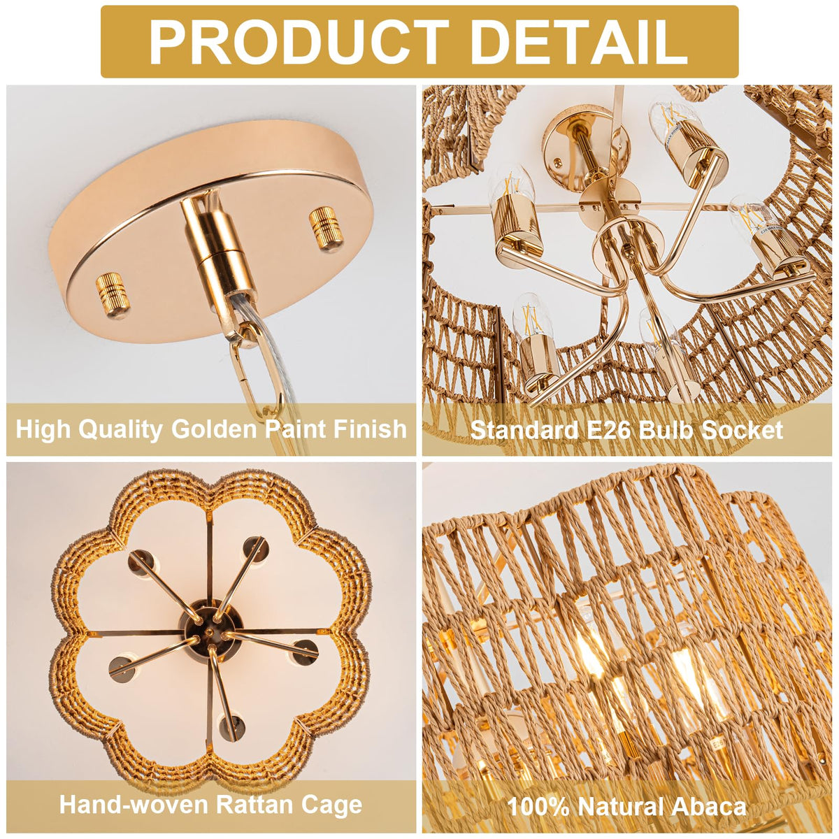 Illuminate Your Living Space With The Warm, Natural Glow Of This 5-Light Rattan Flush Mount Ceiling Light. Crafted From Intricately Woven Rattan, This Chandelier Exudes A Rustic Charm That Adds A Touch Of Elegance To Any Room. Suitable For Both Living Rooms And Dining Areas, This Light Fixture Creates A Cozy Ambiance That Invites Relaxation And Conversation. With Its Versatile Design, It Seamlessly Blends With Various Decor Styles, From Coastal To Bohemian. Enjoy The Gentle Illumination And Organic Texture That This Rattan Chandelier Brings To Your Home. Please Note That Due To The Handcrafted Nature Of This Product, Slight Variations In Color And Weave Pattern May Occur, Adding To Its Unique Character. Transform Your Space Effortlessly - This Convertible Rattan Chandelier Works As A Pendant Light Or Flush Ceiling Fixture. Simply Swap Between The Included Adjustable Gold Chain (For Hanging Over Dining Tables) And The 3.15-Inch Rod (Ideal For Low Ceilings In Kitchens, Hallways, Or Coastal Bedrooms). All Hardware Passes Safety Testing For Both Installation Modes. Elevate Your Dining Room Chandelier Game With This Triangle-Woven Gold Rattan Masterpiece. The 8-Petal Plum Blossom Design Merges Farmhouse Charm And Boho Artistry, Its Three-Dimensional Weave Filtering Light Into Dynamic Geometric Patterns. The Electroplated Gold Frame Ensures Humidity Resistance, While The Adjustable Chain Adapts To Kitchen Islands, Dining Nooks, Or Entryways. Pair With Our Linear-Weave Variant For Layered Texture. Crash-Tested Shipping, And Compatible With Smart Dimming Systems.